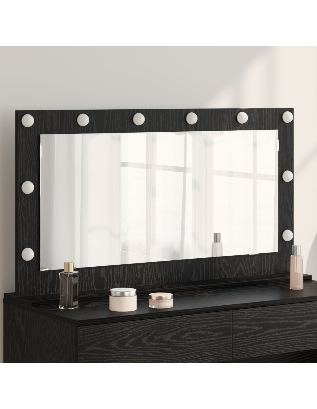 - Materiali top: Questo specchio LED da trucco è realizzato con vetro e legno ingegnerizzato, offrendo look elegante e resistenza. Il vetro assicura una superficie riflettente perfetta, mentre la base in legno garantisce solidità, rendendolo un'opzione robusta per l'uso quotidiano.