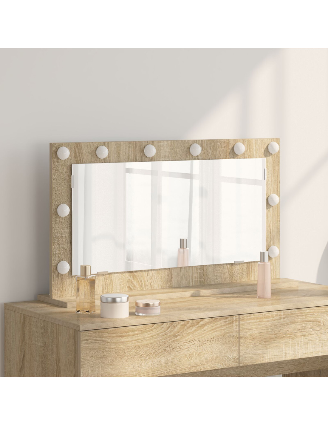 Questo specchio LED da trucco mescola design moderno e praticità, rendendolo l'aggiunta perfetta per ogni camera da letto. Con il suo look contemporaneo e chic, è sia decorativo che utile, ideale per chi cerca eleganza e comfort. La sua disposizione e luci offrono un'atmosfera calda, perfetta per il proprio look e preparativi. È progettato per rendere la tua routine quotidiana più semplice e migliorare il tuo spazio.