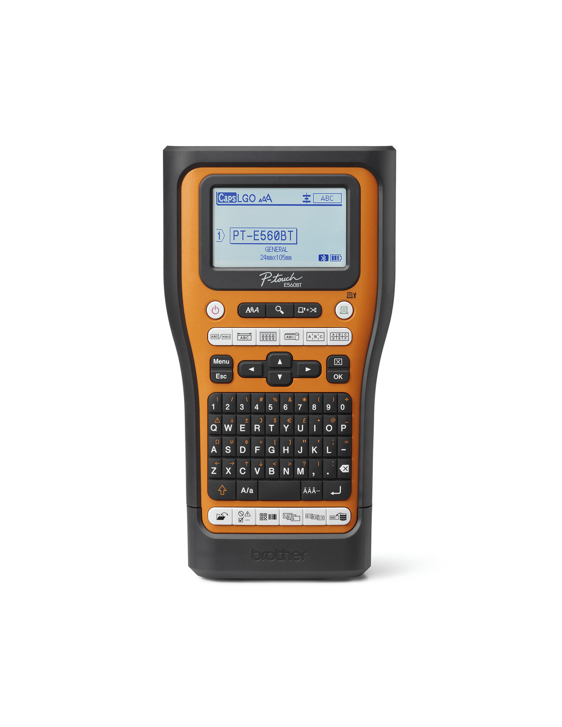 Brother PTE560BTVPQL1. Tecnologia di stampa: Trasferimento termico, Risoluzione massima: 180 x 180 DPI, Velocità di stampa: 20 mm/s. Tecnologia di connessione: Con cavo e senza cavo, Bluetooth, Versione Bluetooth: 5.0, Porta USB. Struttura tastiera: QWERTY. Tipo nastro: HSE/TZe. Colore del prodotto: Nero, Arancione