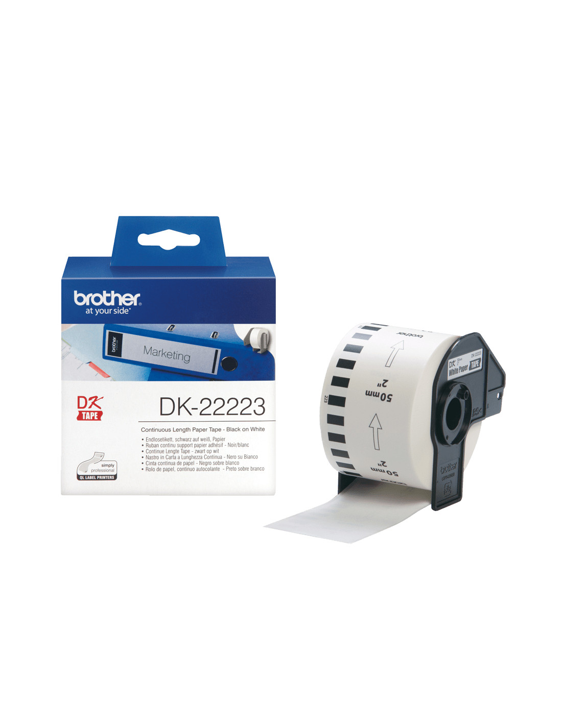 Se stai preparando etichette per buste, cartelline o contrassegni per scaffali, apprezzerai la possibilità di creare etichette di qualsiasi lunghezza. Il nastro di etichette di carta a lunghezza continua DK-22223 è dotato di un potente adesivo che gli consente di essere incollato in modo permanente. Perciò, ti sarà utile sia al lavoro, in ufficio, sia a casa, nello studio.