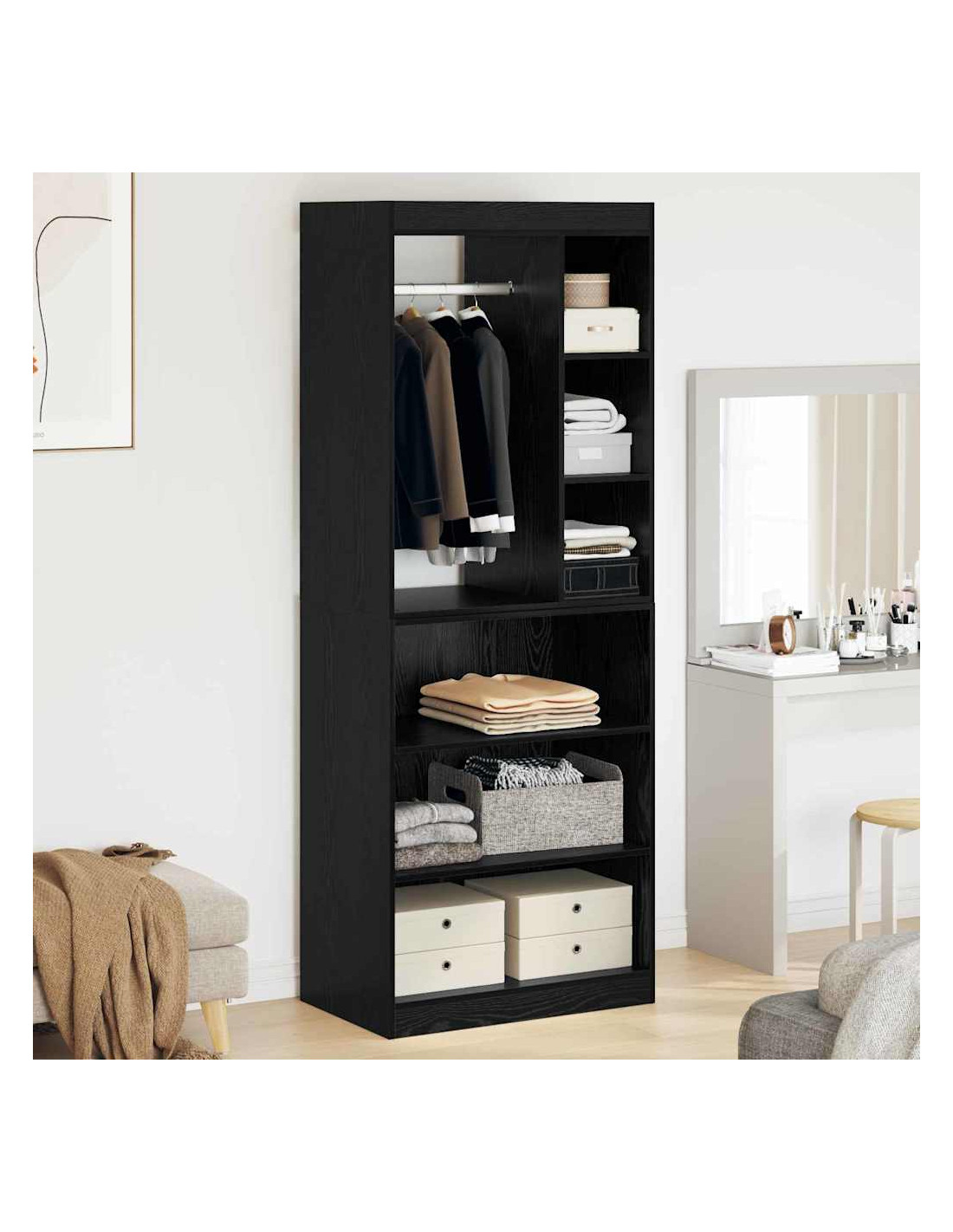 - Spazio di stoccaggio generoso: Questo armadio offre molto spazio, con scomparti progettati per tenere in ordine vestiti e accessori. È ideale per chi ha tante cose, assicurando che ogni cosa abbia il suo posto.