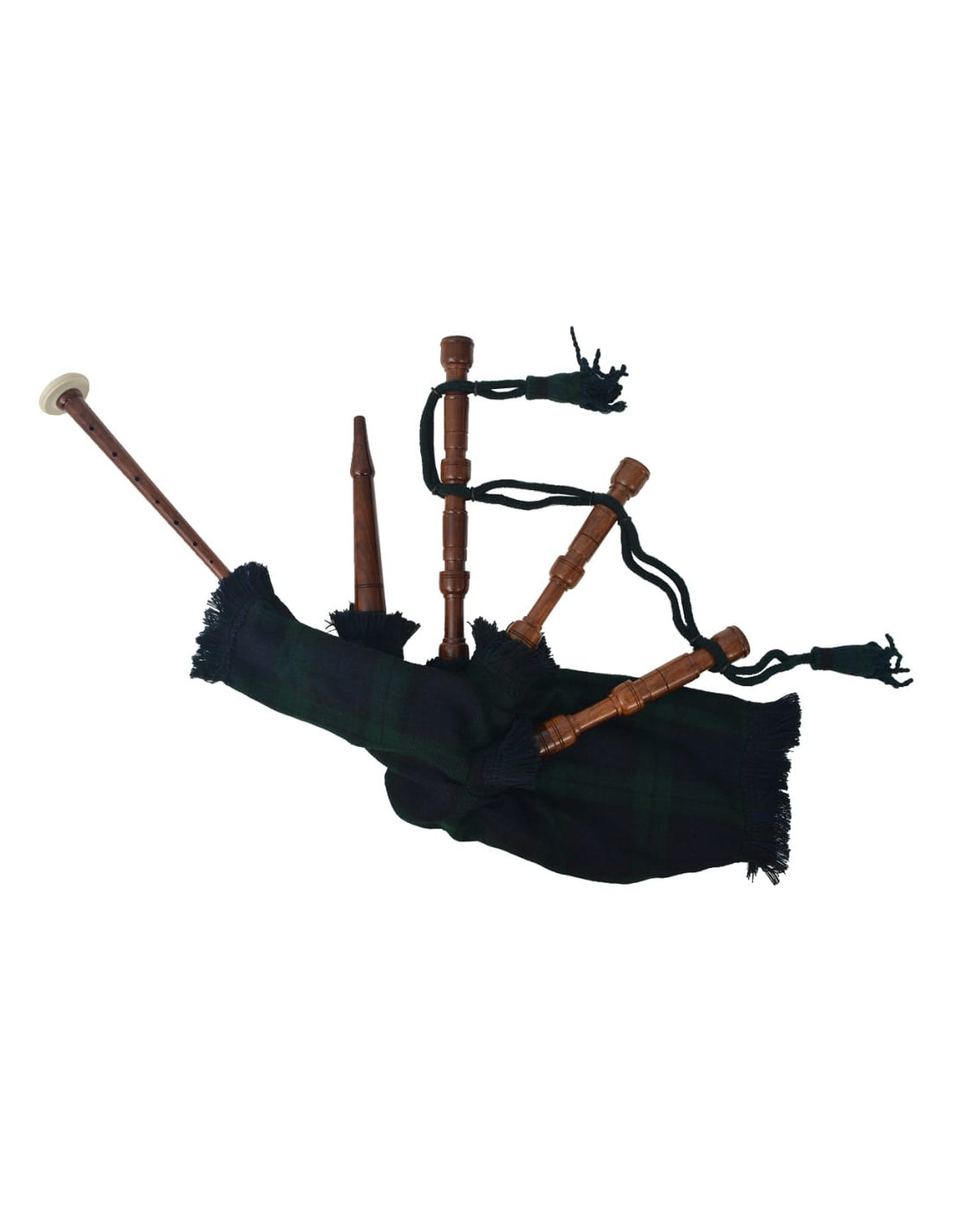 La sacca è realizzata in materiale sintetico di alta qualità e coperta in watch tartan verde e nero. È stata abilmente realizzata per essere ermetica al 100%. Le canne sono realizzate con il legno più pregiato e presentano una finitura liscia in palissandro. Il chanter è utilizzato per suonare la melodia.