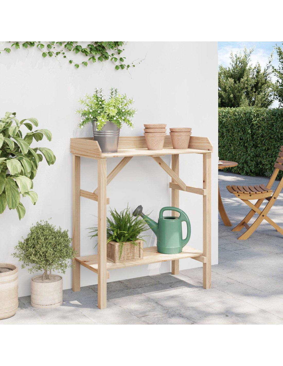 - Sistema di ripiani: Dotato di ripiani in legno, offre molto spazio per organizzare gli attrezzi, i vasi e altro. Questo design semplice ti consente di usare il tavolo in modo versatile.