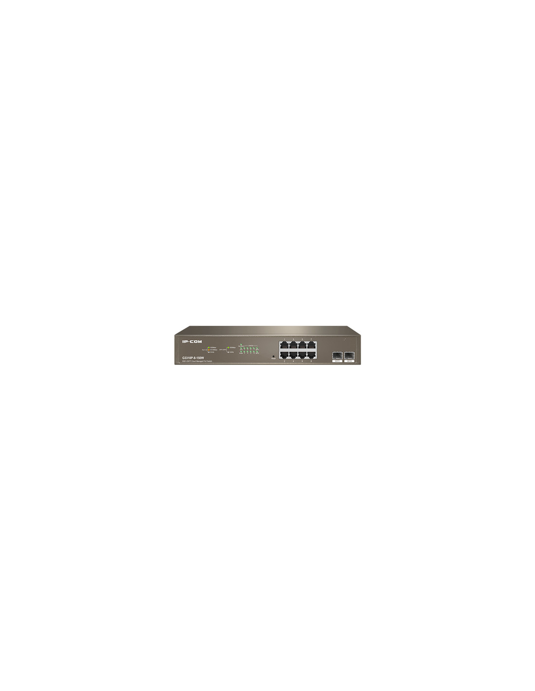 IP-COM Networks G3310P-8-150W. Tipo interruttore: Gestito, Livello del commutatore: L2. Tipo di porte RJ-45: Gigabit Ethernet (10/100/1000), Quantità di porte RJ-45: 8. Full duplex. Dimensioni tavola MAC: 8000 voci, Capacità di commutazione: 20 Gbit/s. Standard di rete: IEEE 802.1D, IEEE 802.1Q, IEEE 802.1p, IEEE 802.1w, IEEE 802.3ab, IEEE 802.3af, IEEE 802.3at, IEEE.... Supporto Power over Ethernet (PoE)