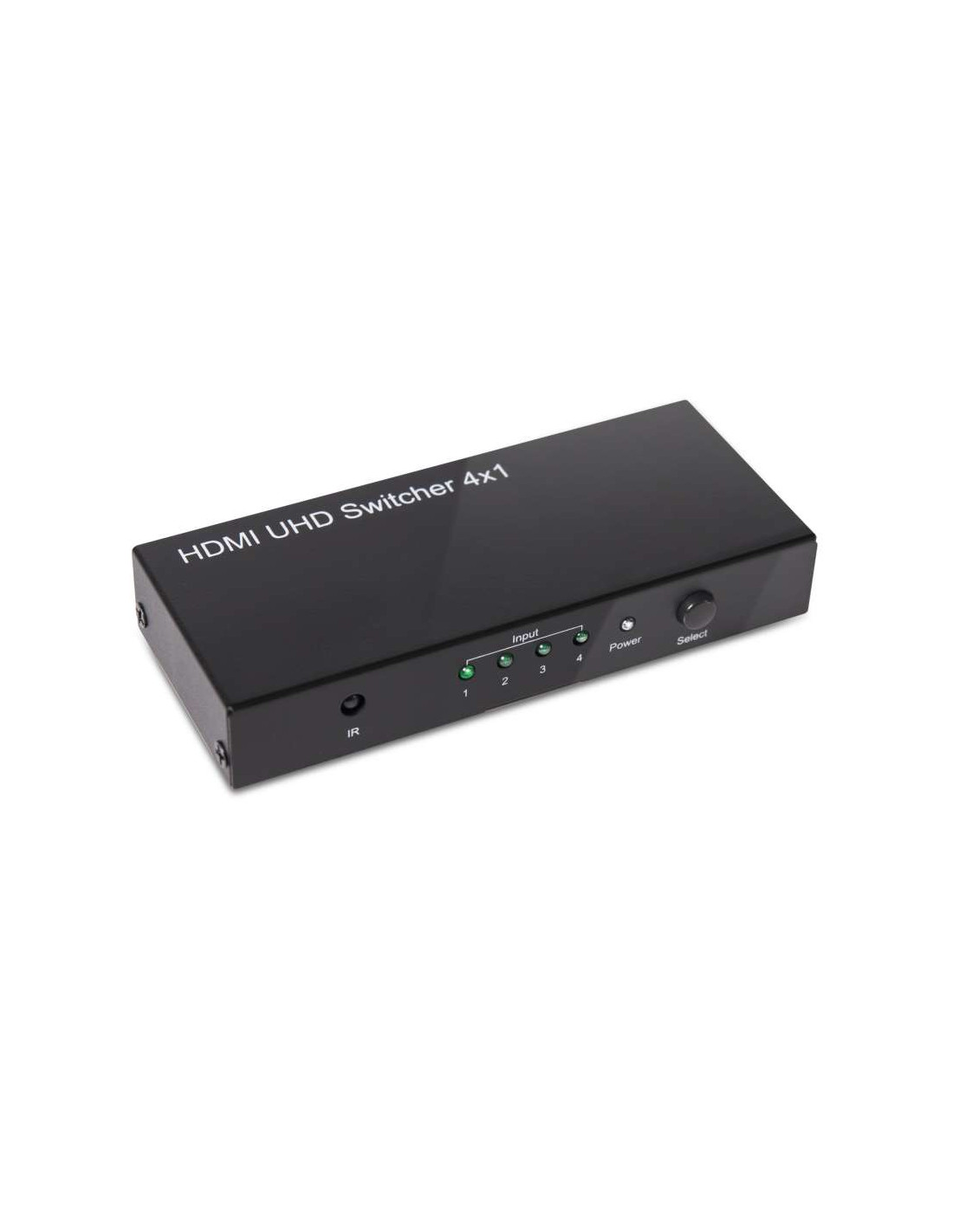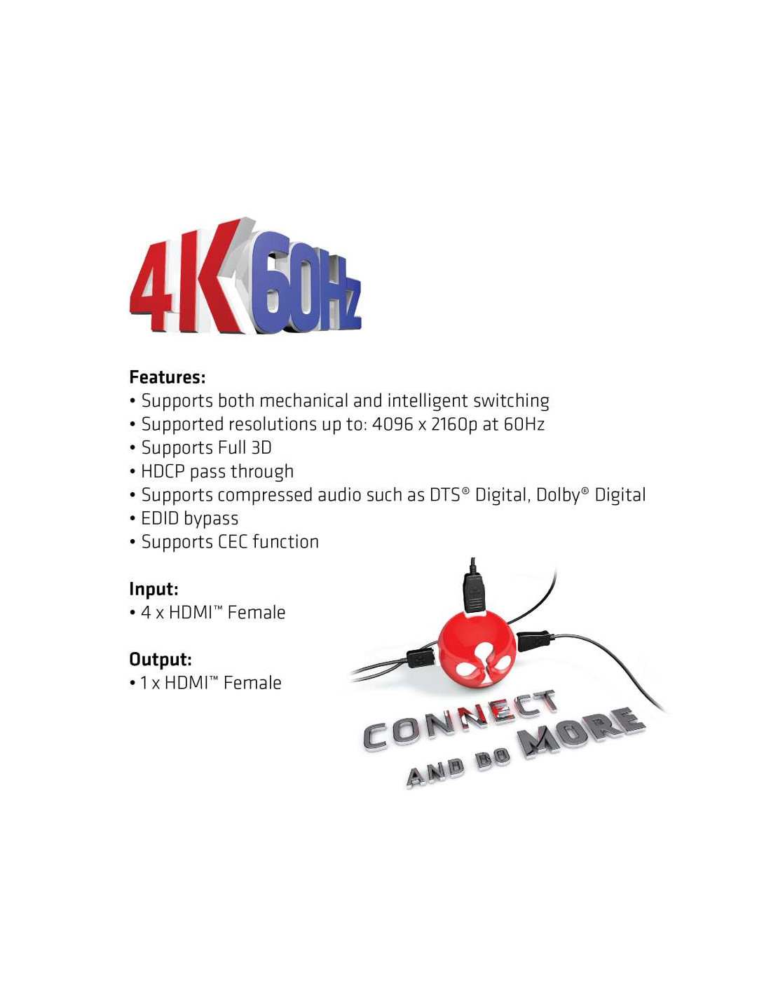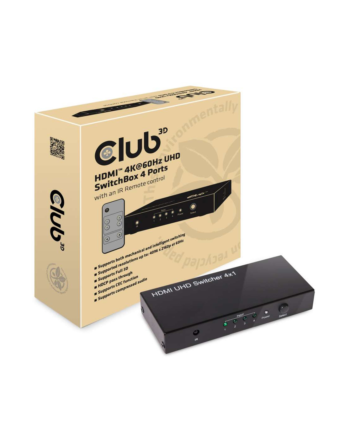 CLUB3D HDMI 2.0 UHD SwitchBox 4 Ports. Tipo porta video: HDMI, Versione HDMI: 2.0a. Risoluzione massima: 4096 x 2160 Pixel, Colore del prodotto: Nero, Materiale della scocca: Metallo. Tensione di ingresso AC: 5 V, Corrente d'uscita: 1 A, Consumi: 5 W. Larghezza: 122 mm, Profondità: 20 mm, Altezza: 50 mm. Quantità per pacco: 1 pz, Larghezza imballo: 180 mm, Profondità imballo: 80 mm