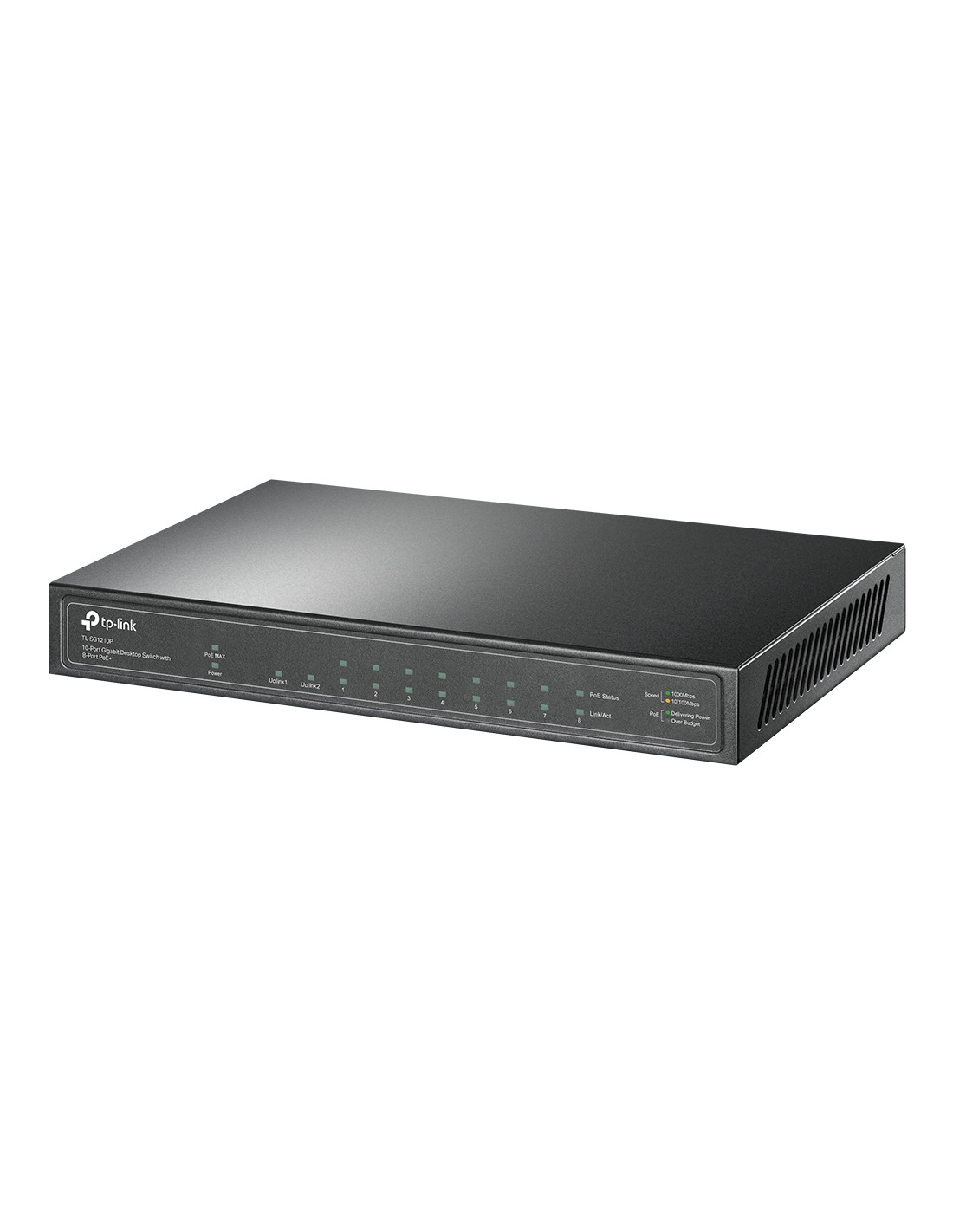 TP-Link TL-SG1210P. Tipo interruttore: Non gestito. Tipo di porte RJ-45: Gigabit Ethernet (10/100/1000), Quantità di porte RJ-45: 9. Dimensioni tavola MAC: 4000 voci, Capacità di commutazione: 20 Gbit/s. Standard di rete: IEEE 802.1p, IEEE 802.3af, IEEE 802.3at, IEEE 802.3x. Voltaggio input DC: 53.5 V. Supporto Power over Ethernet (PoE). Montabile a parete