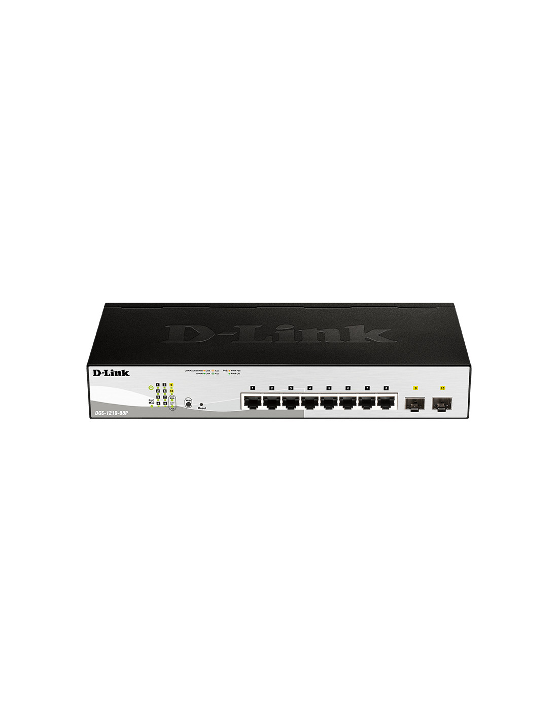 D-Link DGS-1210-08P. Tipo interruttore: Gestito, Livello del commutatore: L2. Tipo di porte RJ-45: Gigabit Ethernet (10/100/1000), Quantità di porte RJ-45: 8. Full duplex. Dimensioni tavola MAC: 16000 voci, Capacità di commutazione: 20 Gbit/s. Standard di rete: IEEE 802.1D, IEEE 802.1w, IEEE 802.3ad, IEEE 802.3af. Supporto Power over Ethernet (PoE). Montaggio rack
