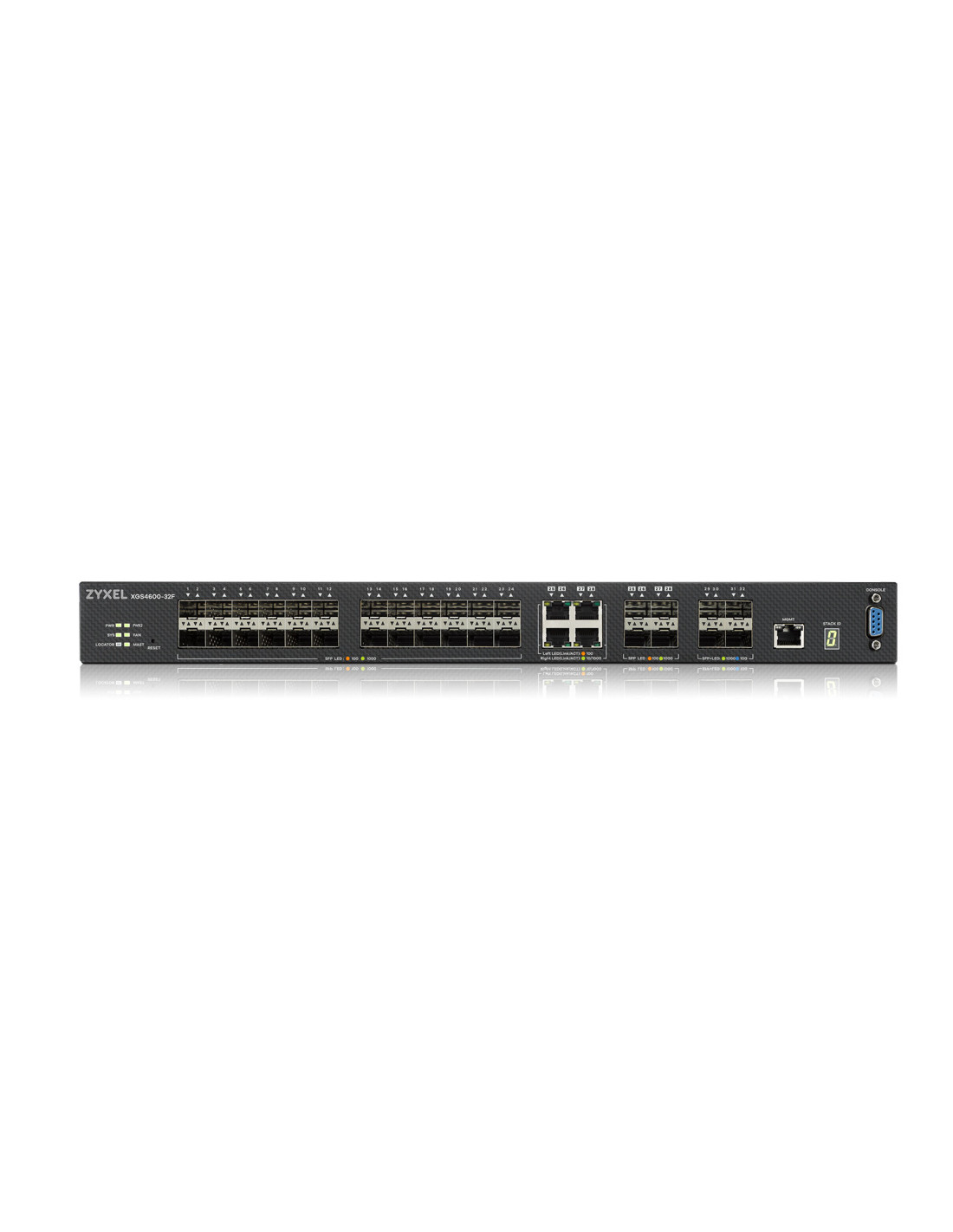Zyxel XGS4600-32F. Tipo interruttore: Gestito, Livello del commutatore: L3. Console port: RS-232. Dimensioni tavola MAC: 32000 voci, Capacità di commutazione: 136 Gbit/s. Standard di rete: IEEE 802.1D, IEEE 802.1Q, IEEE 802.1ad, IEEE 802.1p, IEEE 802.1s, IEEE 802.1w, IEEE 802.1x, IEEE.... Montaggio rack