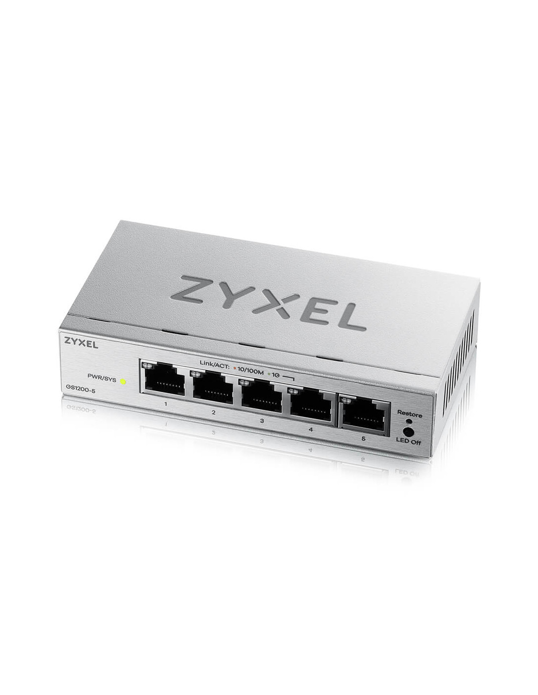 Zyxel GS1200-5V3. Tipo interruttore: Gestito, Livello del commutatore: L2. Tipo di porte RJ-45: Gigabit Ethernet (10/100/1000), Quantità di porte RJ-45: 5. Full duplex. Dimensioni tavola MAC: 4000 voci, Capacità di commutazione: 10 Gbit/s. Standard di rete: IEEE 802.1Q, IEEE 802.1p, IEEE 802.3, IEEE 802.3ab, IEEE 802.3ad, IEEE 802.3az, IEEE 802.3u, IEEE.... Connettore di alimentazione: Jack DC-ingresso. Fattore di forma: Desktop