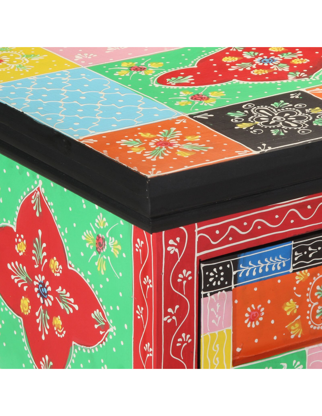 Questo tavolo console bohémien unisce design eclettico e colori vivaci in un arredo che attira l'attenzione, rendendo qualsiasi camera da letto o spazio interno più interessante. È realizzato in legno massello di mango e legno ingegnerizzato e si distingue per il suo stile bohémien unico, mescolando diverse texture e modelli per creare un’atmosfera artistica e libera. È perfetto per chi ama decorazioni per interni originali, fungendo sia da elemento decorativo che da pratico supporto.