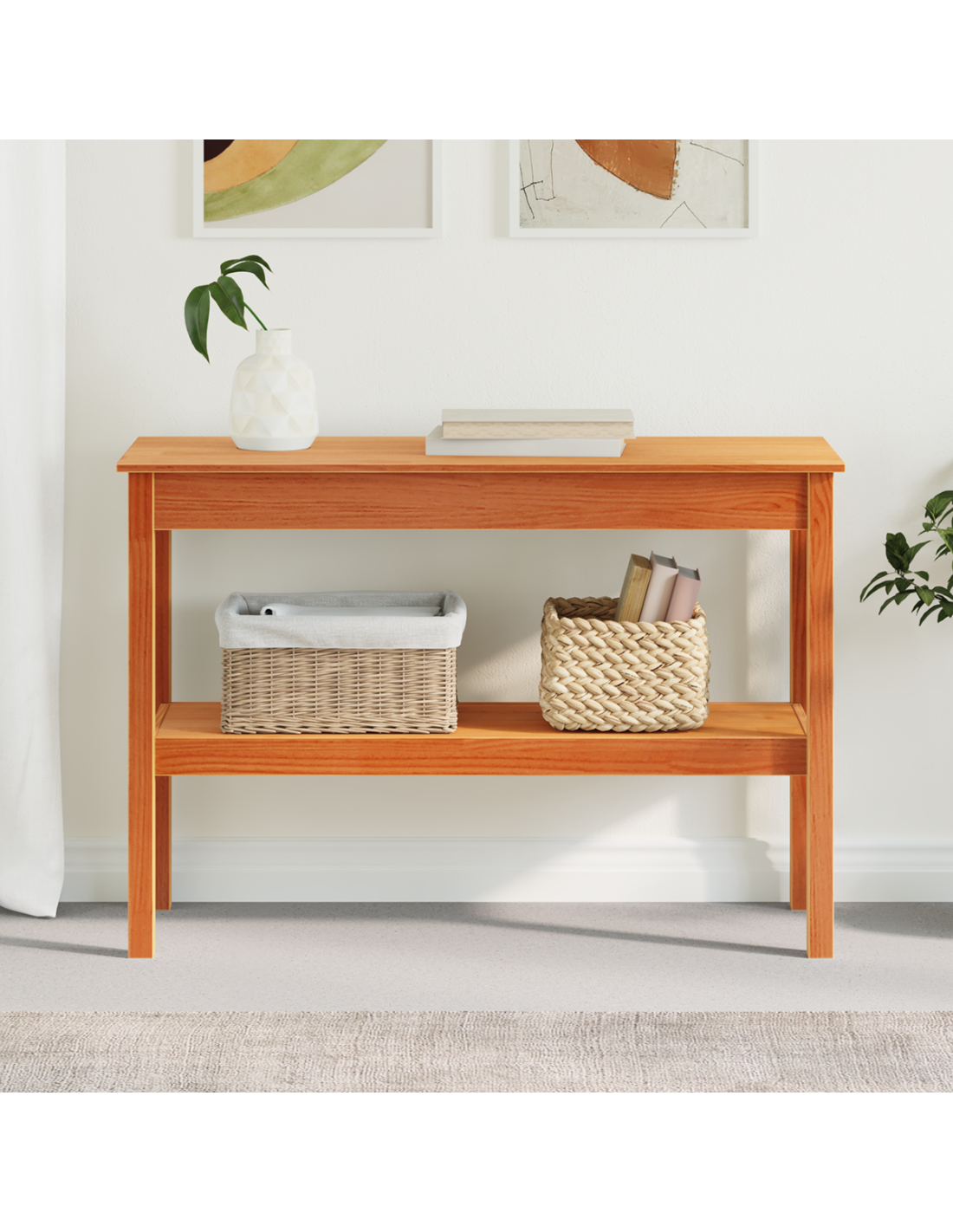 - Costruzione in pino massello Questo tavolo consolle è realizzato con cura in legno di pino massello per garantire durata e affidabilità. La finitura del legno aggiunge eleganza e protegge dall'usura quotidiana, mentre la struttura robusta sostiene facilmente decorazioni e oggetti essenziali.