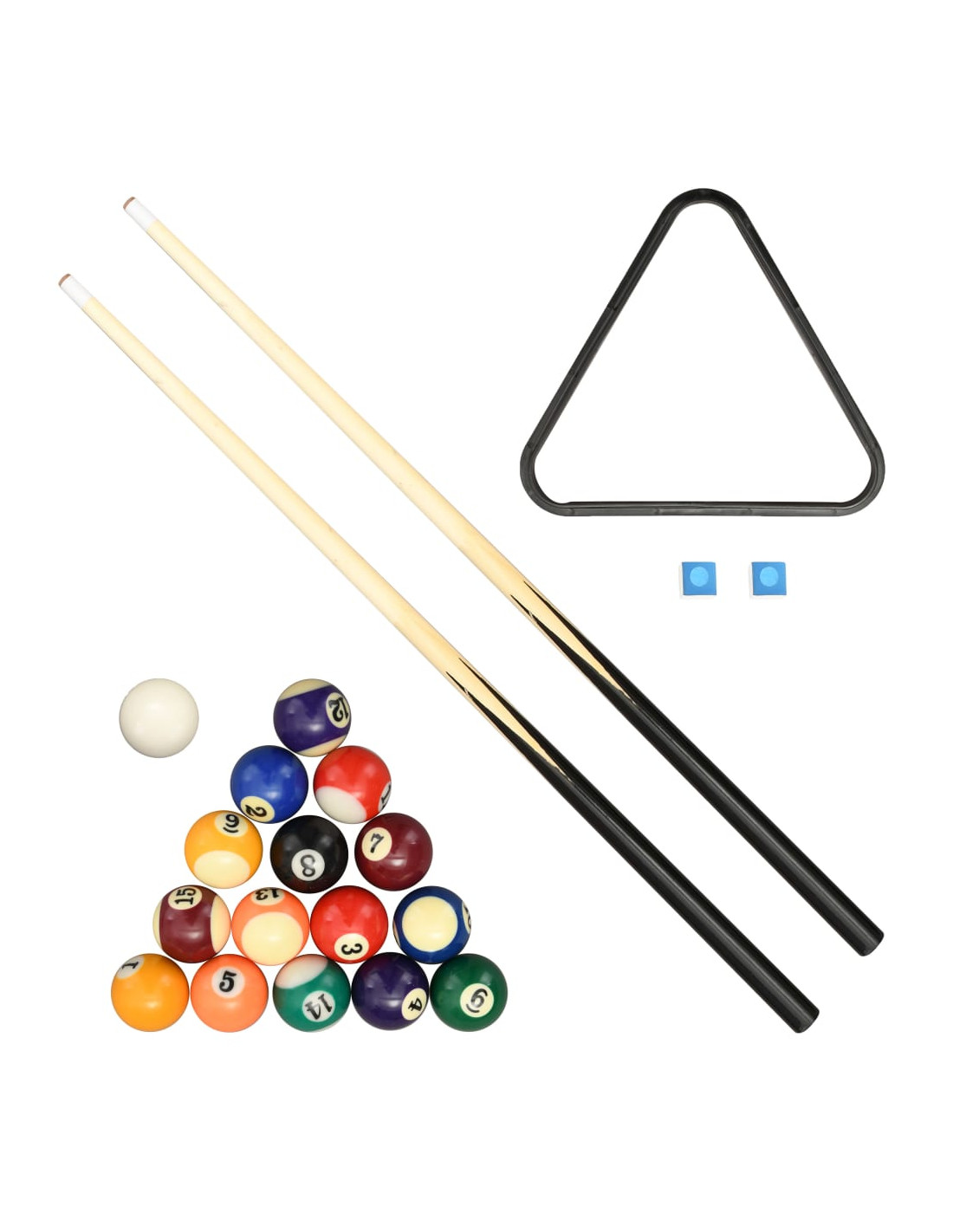 Questo divertente set include 1 tavolo da biliardo, 1 rastrelliera triangolare, 16 palline, 2 stecche e 2 gessetti da biliardo.