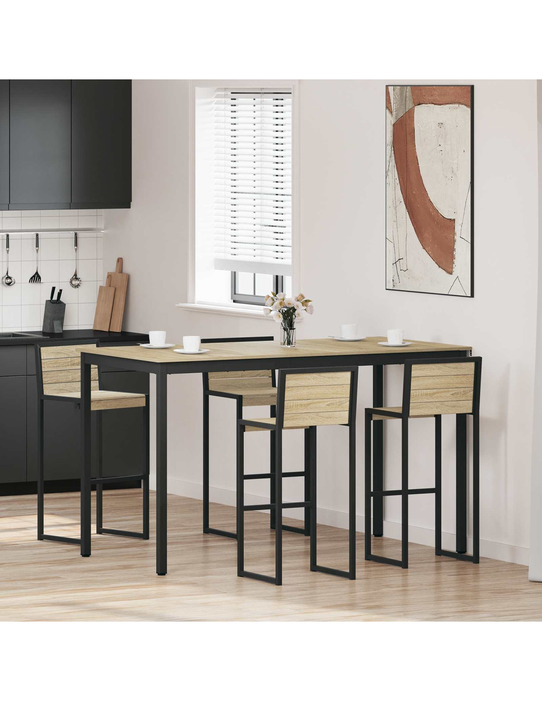 - Materiali solidi: La superficie è in legno ingegnerizzato, resistente e bella da vedere. Le gambe in metallo e il telaio sono robusti, garantendo stabilità per un uso frequente senza perdere il suo stile.