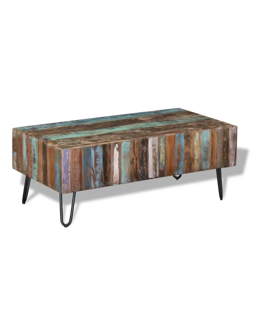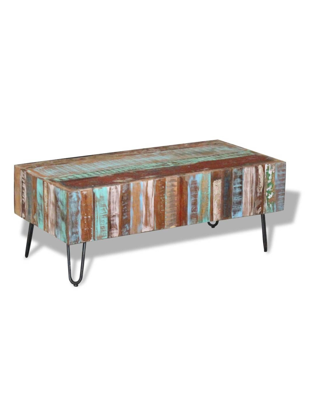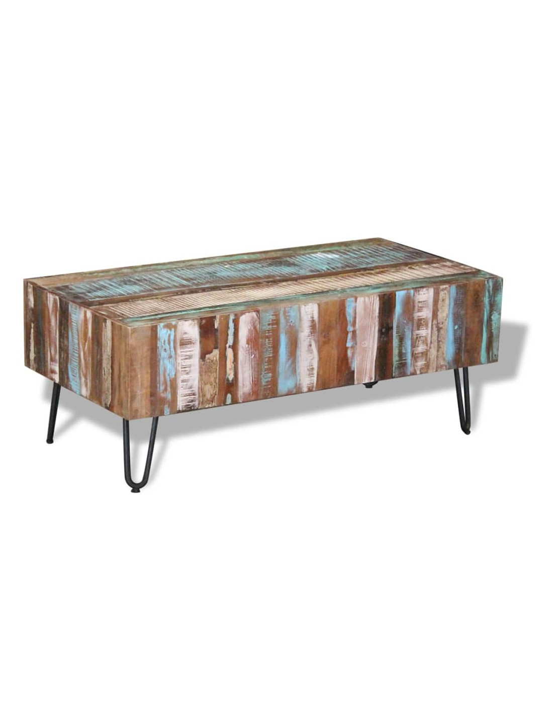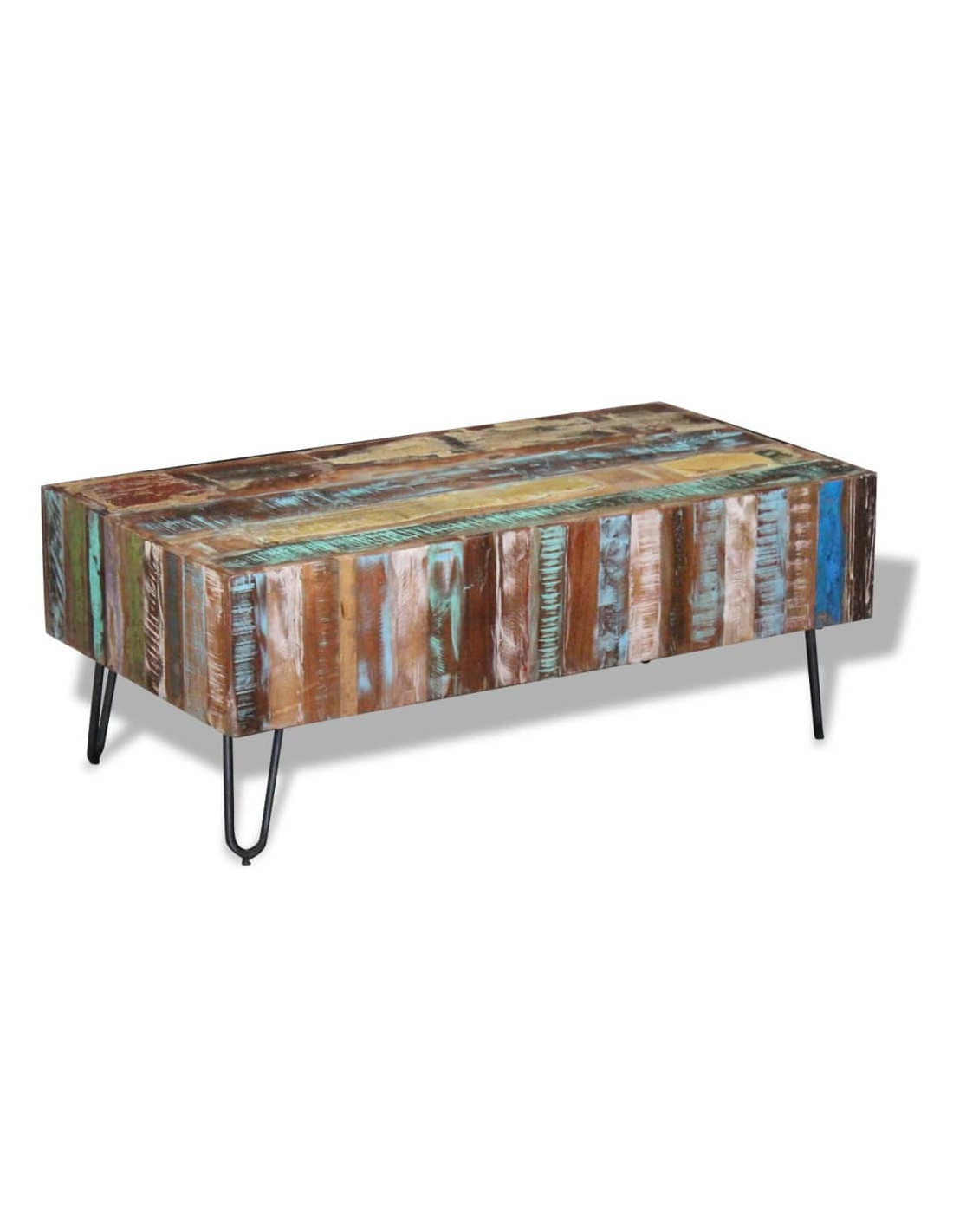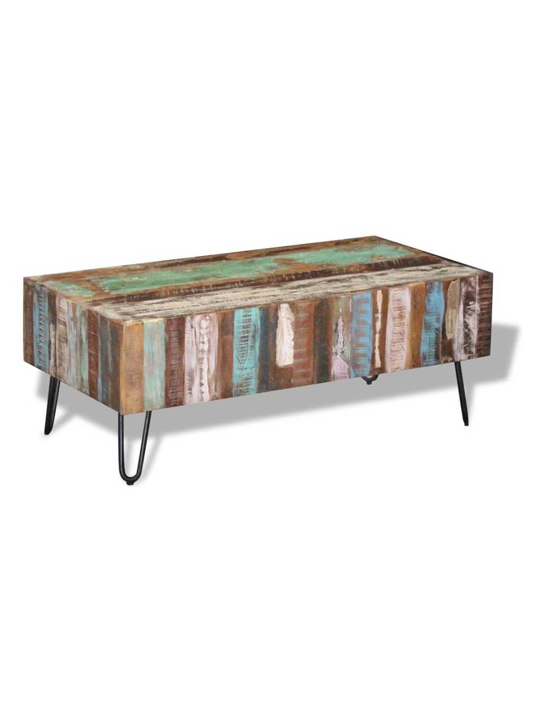 Il piano del tavolo è realizzato in legno di recupero, il che significa che ogni mobile è unico e leggermente diverso da tutti gli altri. I mobili realizzati in legno di recupero presentano le caratteristiche di legni diversi come il teak, il legno di mango e l'acacia. Il legno recuperato è solido, stabile, durevole e bello. Segni di usura e struttura a grana visibile conferiscono a ogni pezzo una propria storia e un aspetto unico.