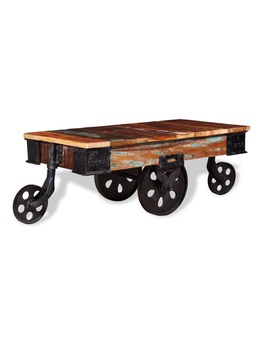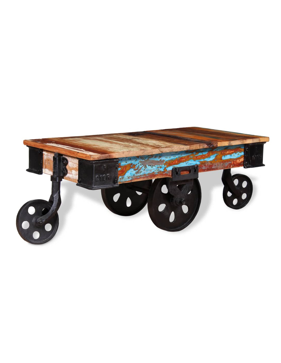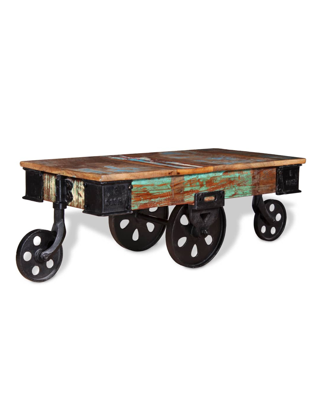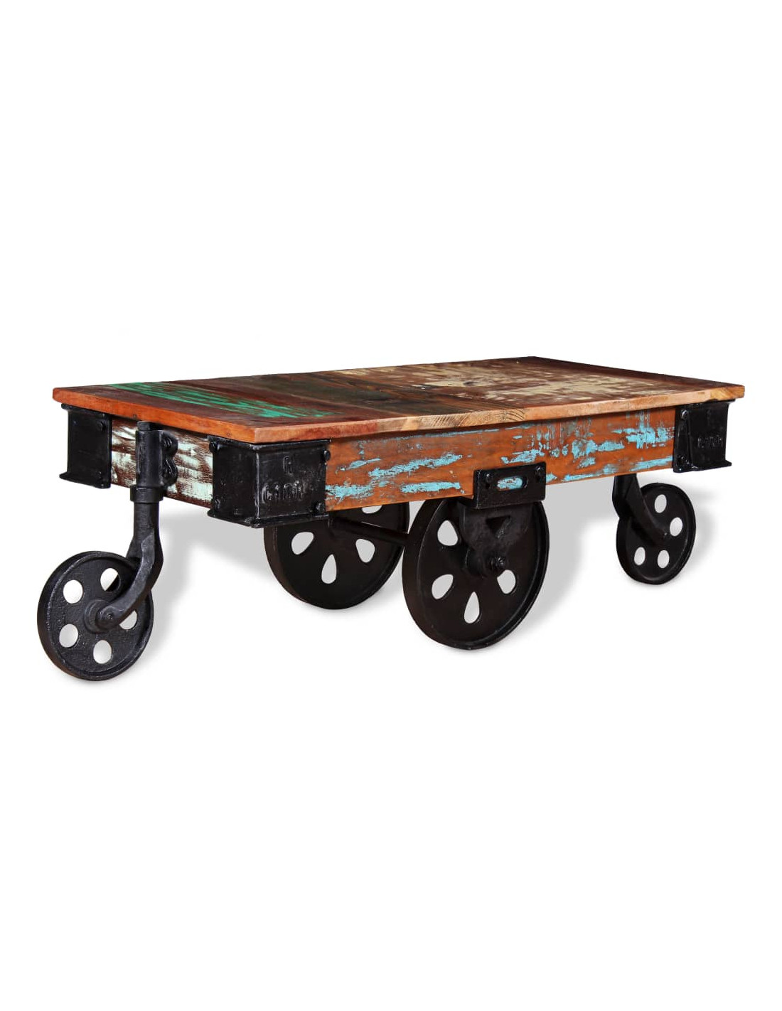 Il tavolino retrò è realizzato a mano in legno di recupero che è stabile, durevole e bello, e presenta le caratteristiche di legni diversi come il teak, il mango, l'acacia, legno riciclato, legno duro, ecc. Ogni fase del processo viene effettuata con la massima cura, che si tratti di levigatura, lucidatura, pittura o laccatura. La lavorazione artigianale e le belle venature del legno rendono ogni mobile unico e leggermente diverso dagli altri. Il tavolo è dotato di 4 ruote in ferro che ne facilitano lo spostamento e completano il design industriale.