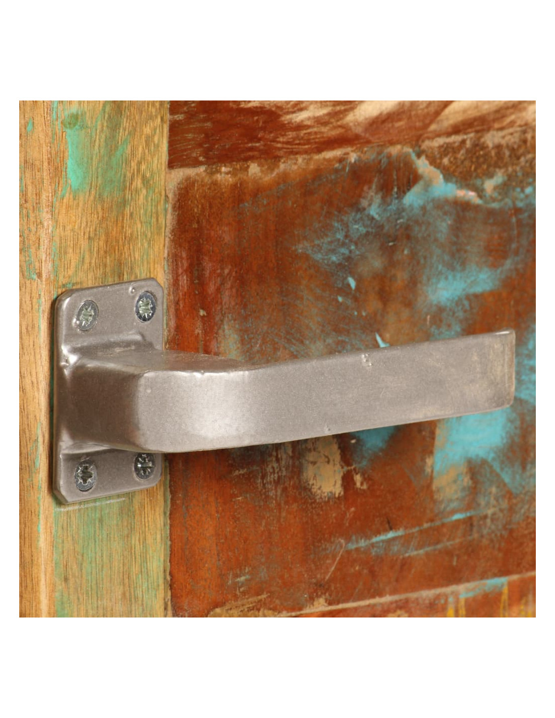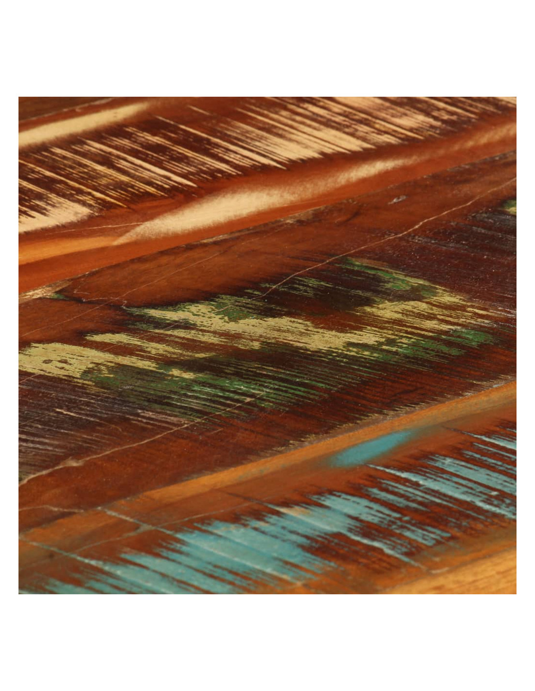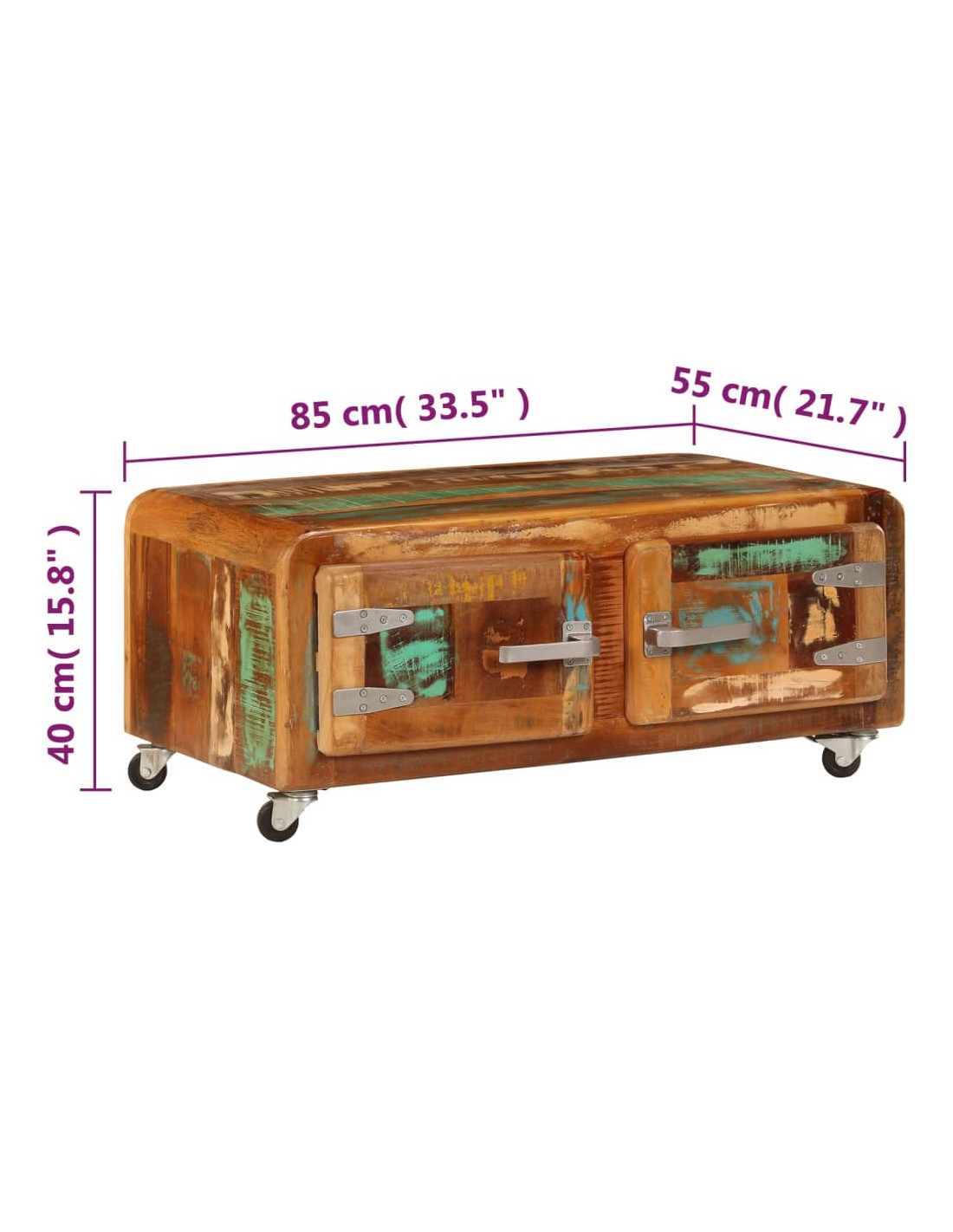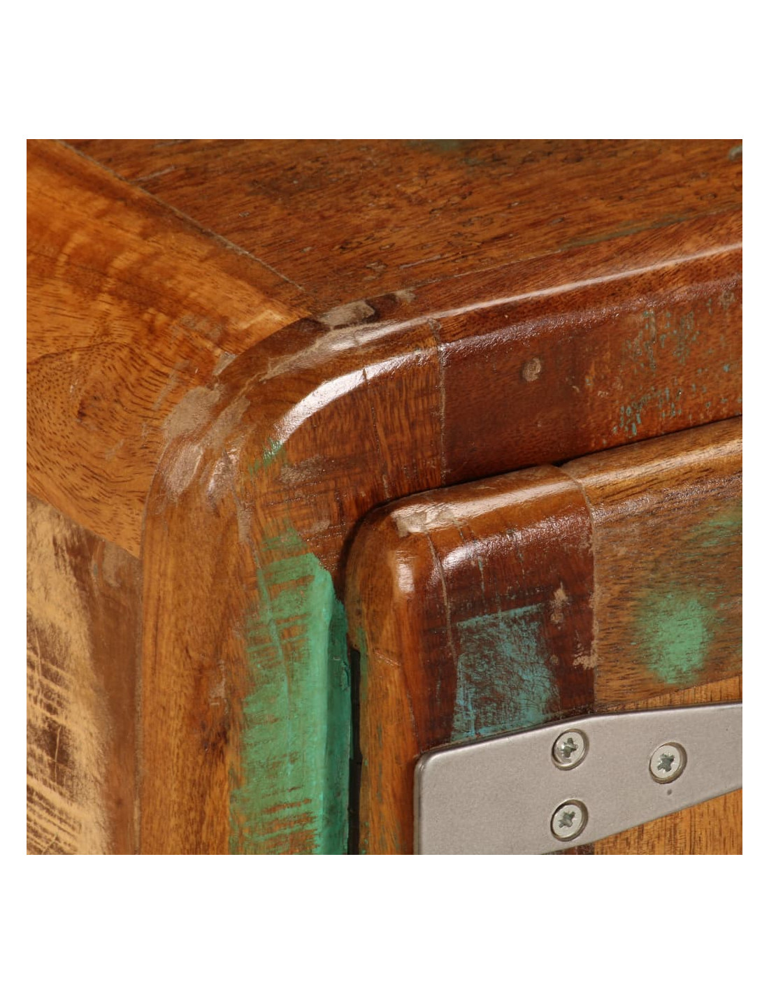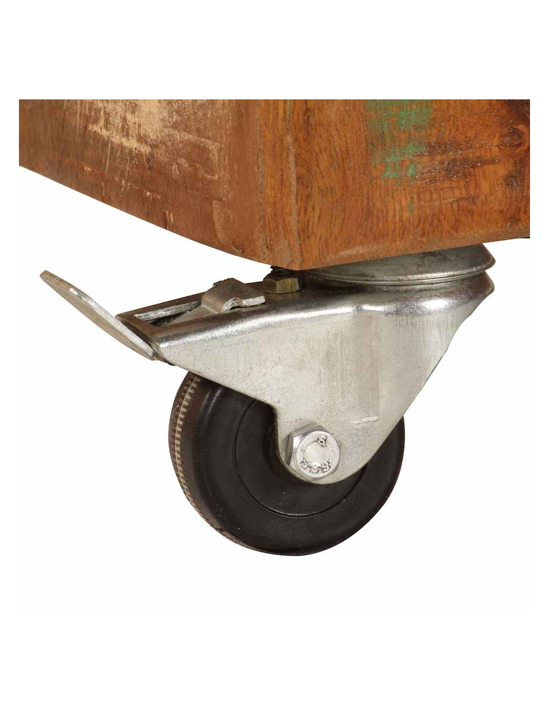 Il tavolino è realizzato in legno massello di recupero proveniente da travetti, pavimenti e travi di supporto di vecchi edifici in fase di demolizione e può essere costituito da diversi tipi di legno come il pino, il teak, il faggio, la quercia, il cedro, il mango, l'acacia, ecc. Ciò significa che il legno di recupero mantiene tutte le caratteristiche di questi diversi tipi di legno. Il legno di recupero è già invecchiato, stagionato ed essiccato, quindi non subisce restringimenti o deformazioni. Questo tavolino è interamente realizzato a mano e le raffinate venature del legno rendono ogni mobile distintivo e leggermente diverso l'uno dall'altro. La ferramenta in metallo aggiunge lo stile industriale del mobile. Questo tavolo è dotato di 2 armadietti con ante, che forniscono ampio spazio per riporre apparecchi multimediali, libri e vari altri oggetti. Dotato di 4 rotelle, il tavolino in legno è facile da spostare.