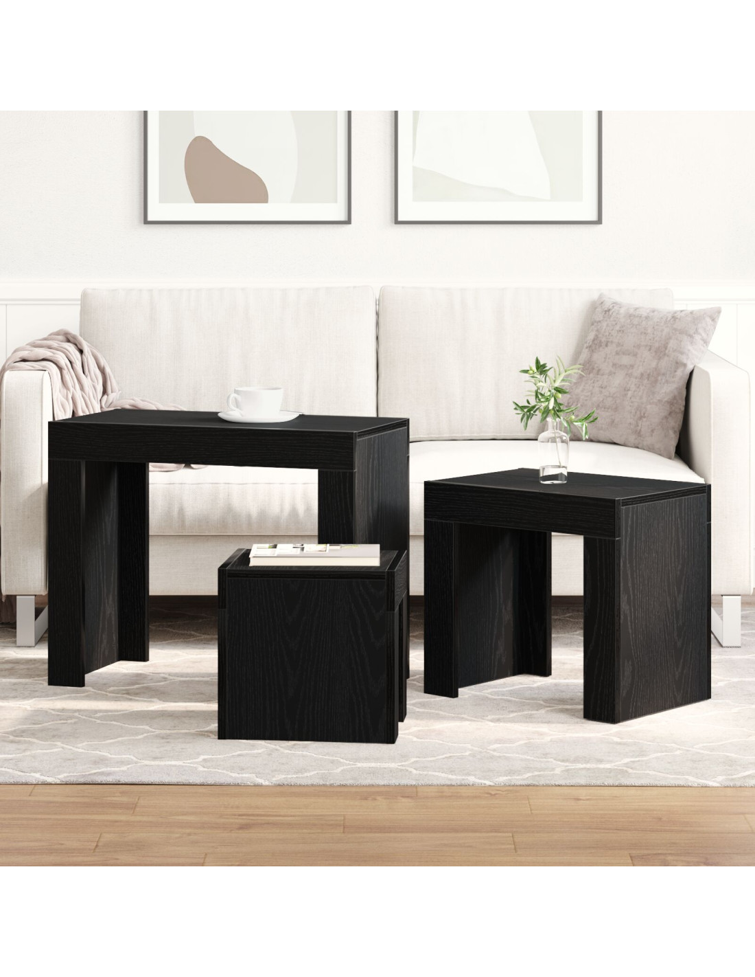 Questo set di tavolini da annidamento è fatto per adattarsi ai soggiorni moderni. Si incastrano l'uno sotto l'altro, facendo risparmiare spazio e aggiungendo un tocco stiloso a qualsiasi ambiente. Con un design semplice e linee pulite, si adattano facilmente a qualsiasi stile decorativo. Non solo belli da vedere, ma anche funzionali, questi tavoli sono perfetti sia per accogliere gli ospiti che come tavolini laterali.