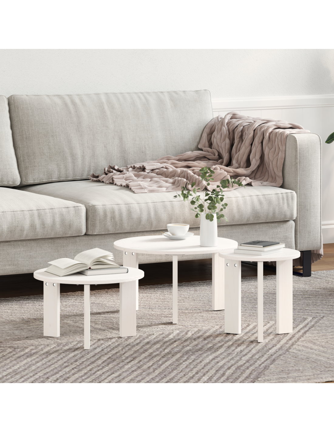 - Design a nidificazione Con tre diverse dimensioni, questi tavoli possono essere riposti uno dentro l'altro per risparmiare spazio. Puoi usarli insieme o separatamente, a seconda di cosa ti serve. Riorganizzali come vuoi, per un tocco pratico e decorativo nel tuo salotto. Perfetto per spazi piccoli dove funzionalità ed estetica devono andare di pari passo.