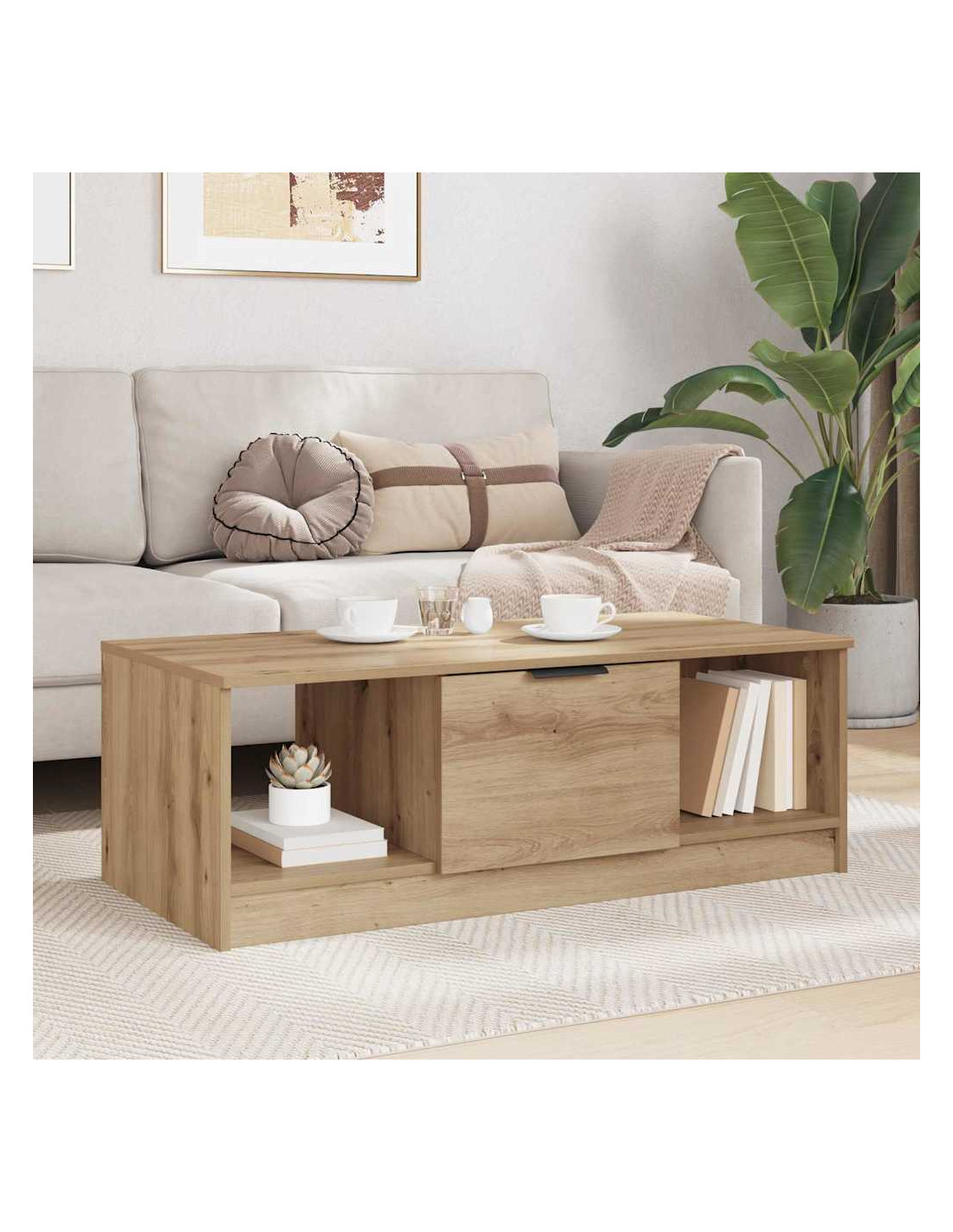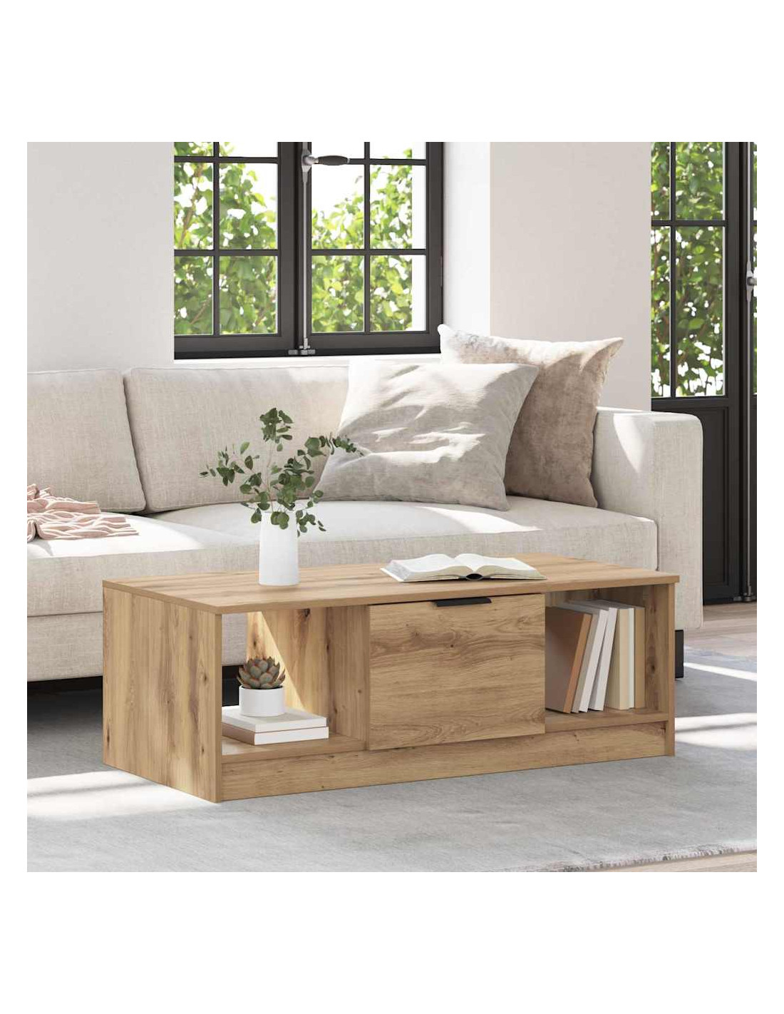Questo tavolino da caffè moderno si adatta perfettamente ai soggiorni contemporanei, offrendo stile e praticità. Realizzato in legno ingegnerizzato resistente, ha un design minimalista che si adatta a qualsiasi arredamento. La superficie elegante è perfetta per bevande, libri e decorazioni, migliorando l'atmosfera di qualsiasi stanza.