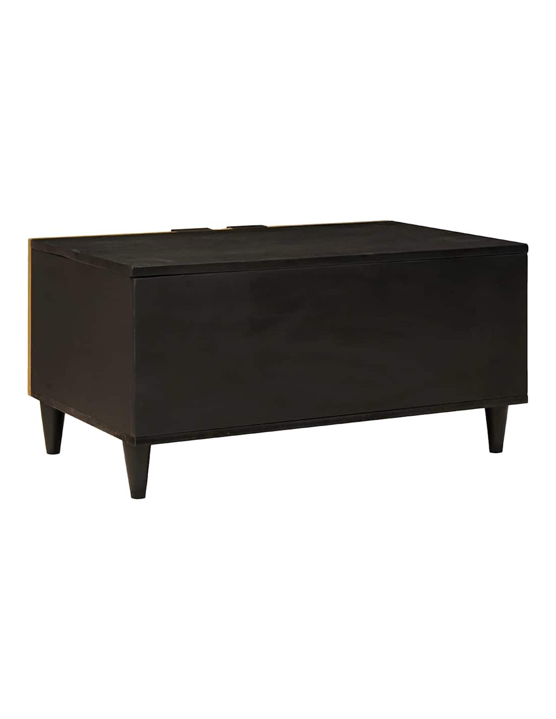 - Componenti Inclusi: Il tavolo ha maniglie in metallo nero per un accesso facile allo spazio di stoccaggio. L'area di stoccaggio è studiata per riporre vari oggetti, mantenendo tutto in ordine. La struttura e le gambe in legno massello di mango garantiscono una buona stabilità.