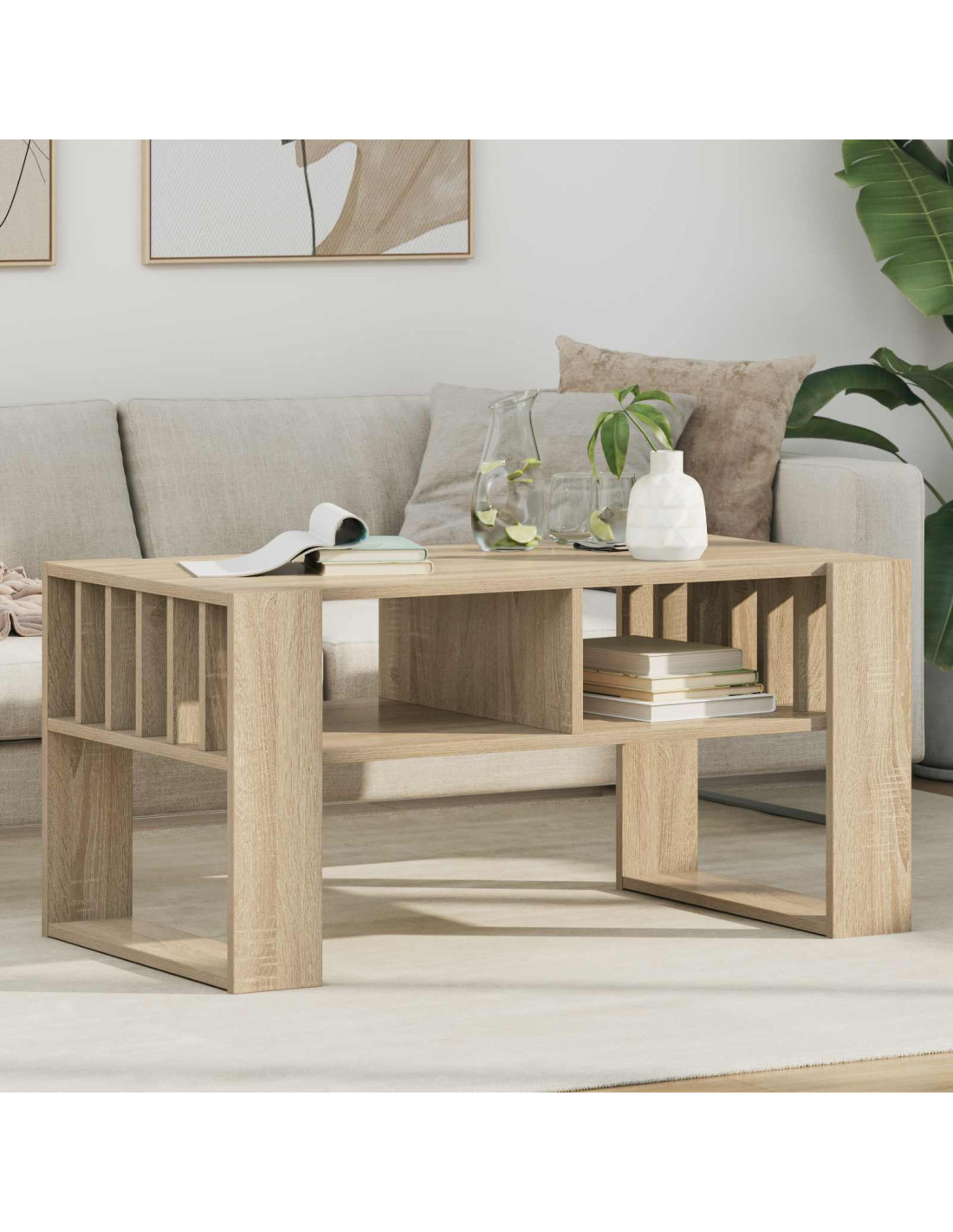 - Ripiani pratici Grazie ai suoi ripiani, il tavolino è ideale per tenere libri, riviste o telecomandi in ordine. Questi ripiani sono semplici e funzionali, si inseriscono bene nel design moderno del tavolo.