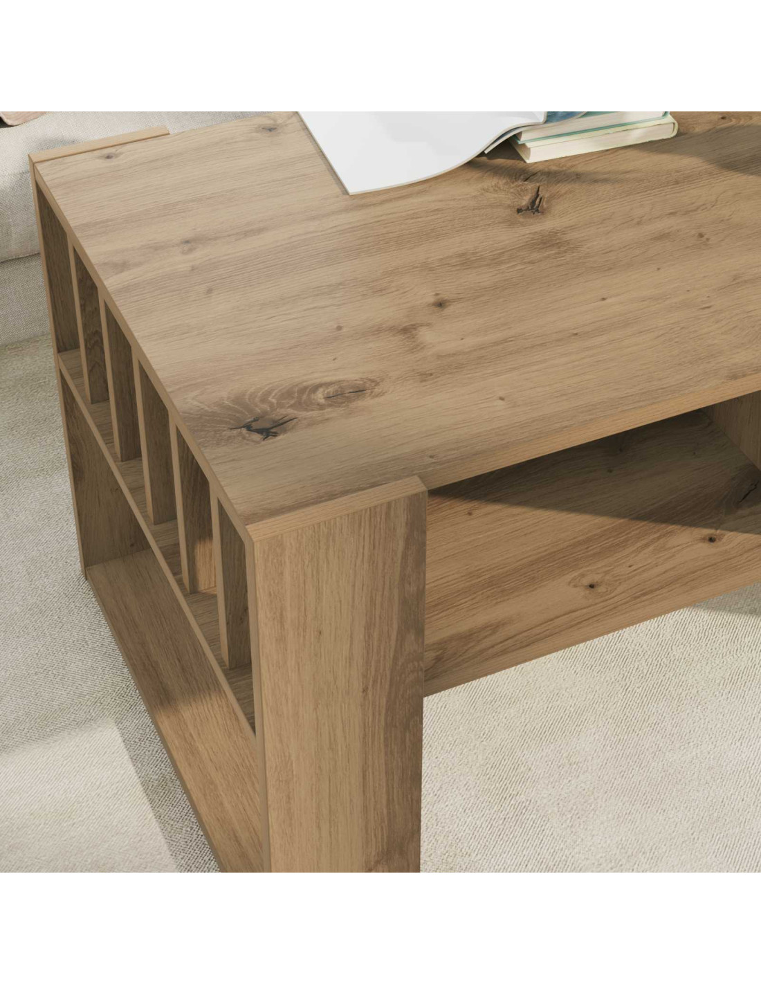 - Ripiani pratici Grazie ai suoi ripiani, il tavolino è ideale per tenere libri, riviste o telecomandi in ordine. Questi ripiani sono semplici e funzionali, si inseriscono bene nel design moderno del tavolo.