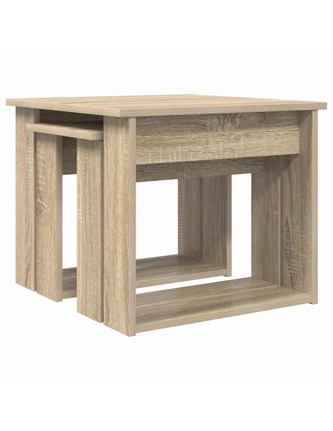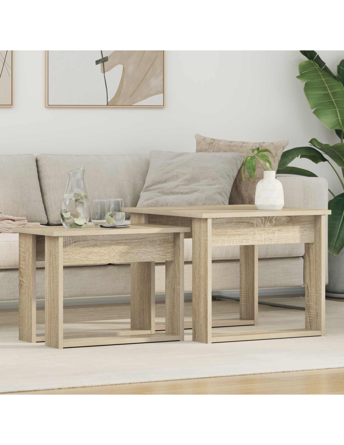 - Legno ingegnerizzato di alta qualità: I tavolini sono realizzati in legno ingegnerizzato premium, scelto per il suo equilibrio tra solidità ed eleganza moderna. La consistenza del materiale assicura che i tavoli resistano all’uso quotidiano e mantengano il loro aspetto. Inoltre, il legno ingegnerizzato offre una superficie liscia, perfetta per decorazioni o chiacchiere tra amici.