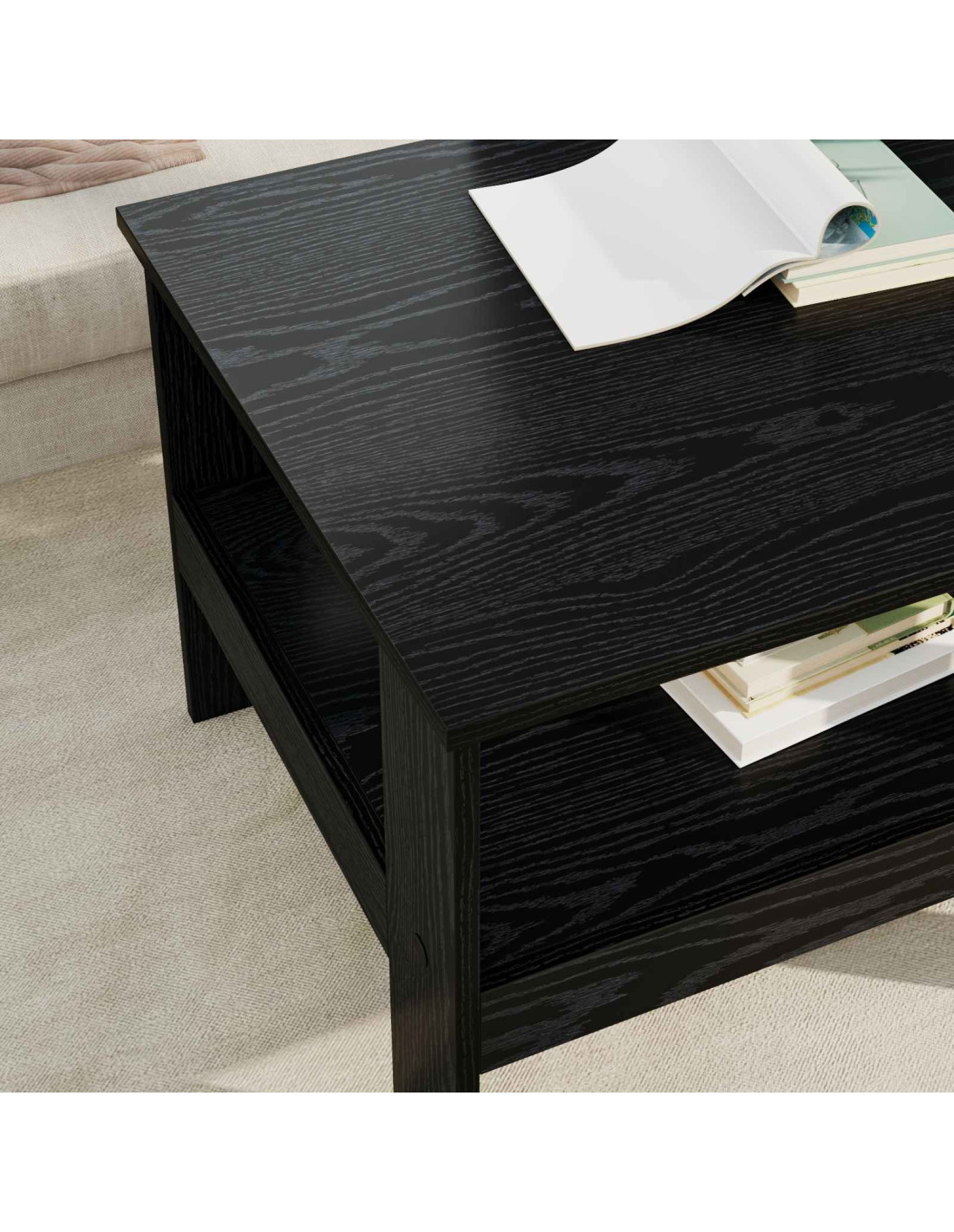 - Ripiani robusti: Sotto il piano del tavolo, i ripiani in legno ingegnerizzato forniscono spazio aggiuntivo per riporre oggetti. Consentono di tenere in ordine riviste, libri o telecomandi, massimizzando lo spazio senza compromettere il design.