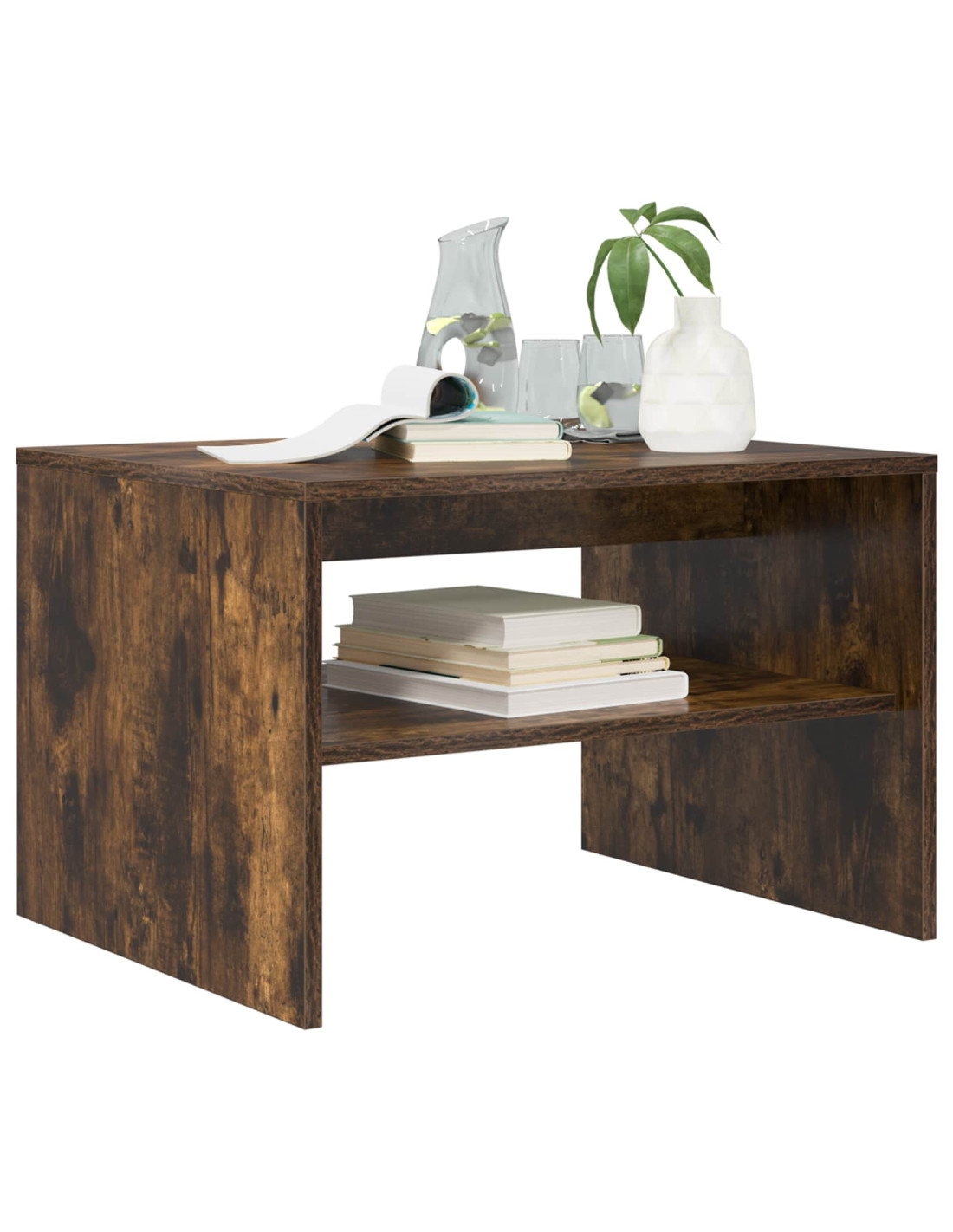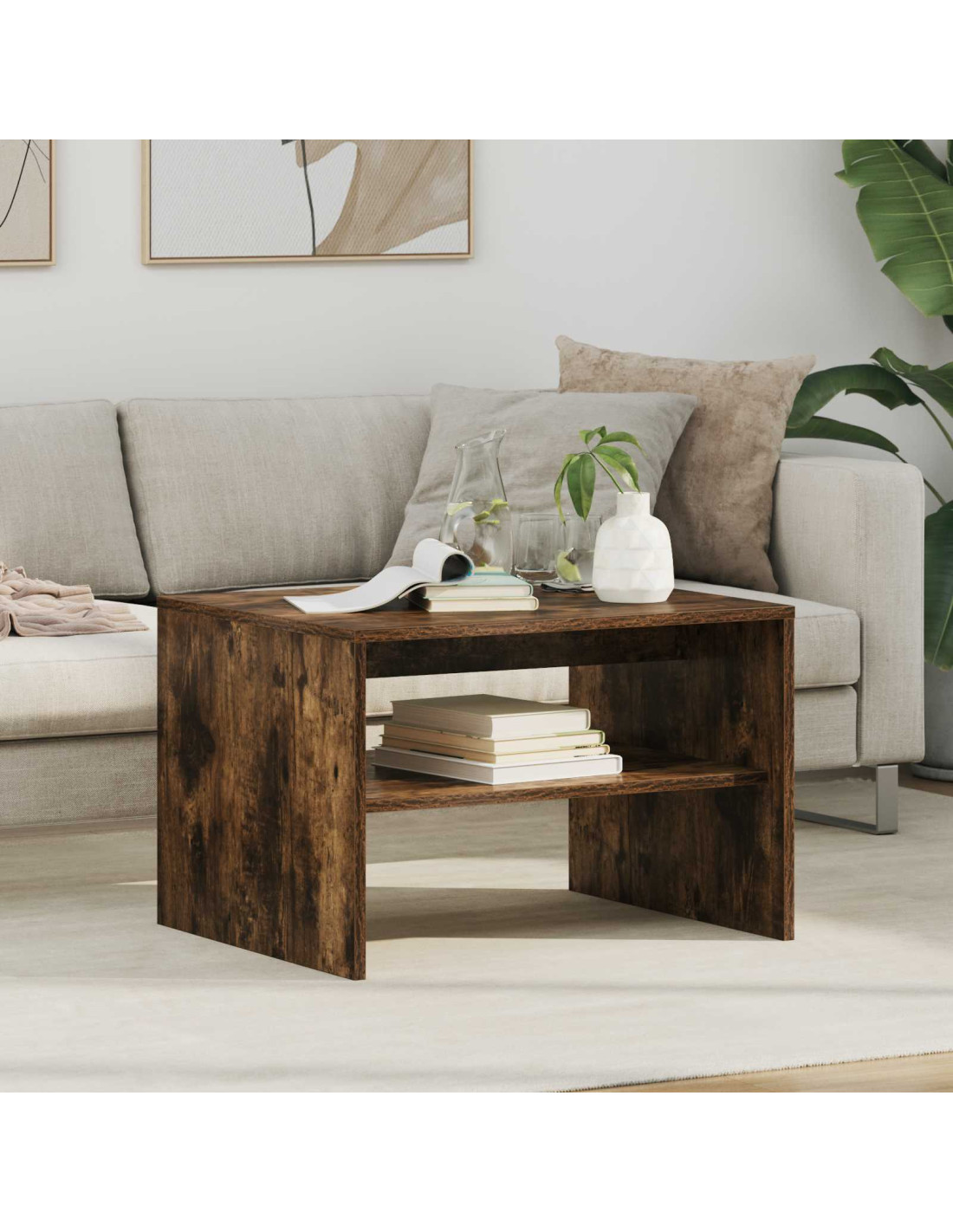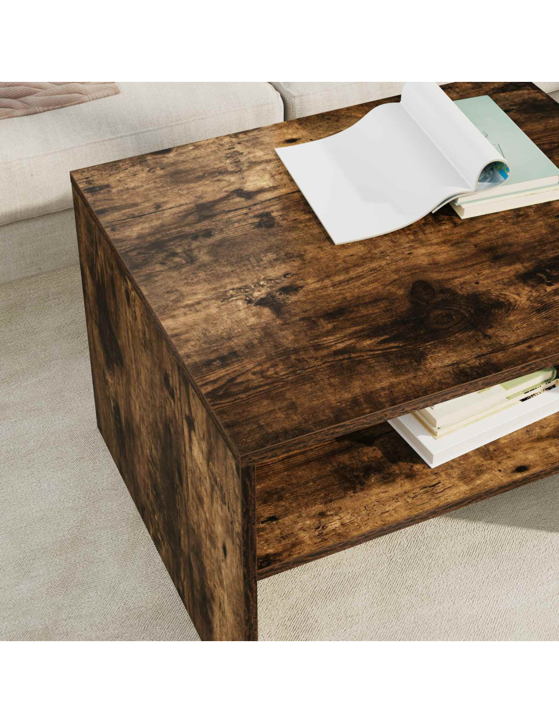 - Ripiani pratici Il tavolino ha ripiani a pannello che incrementano la funzionalità e forniscono soluzioni per riporre le cose. Questi ripiani, realizzati in legno ingegnerizzato dello stesso tipo, offrono un’armonia di materiali e aspetto, permettendo di organizzare libri, riviste e altri oggetti facilmente.