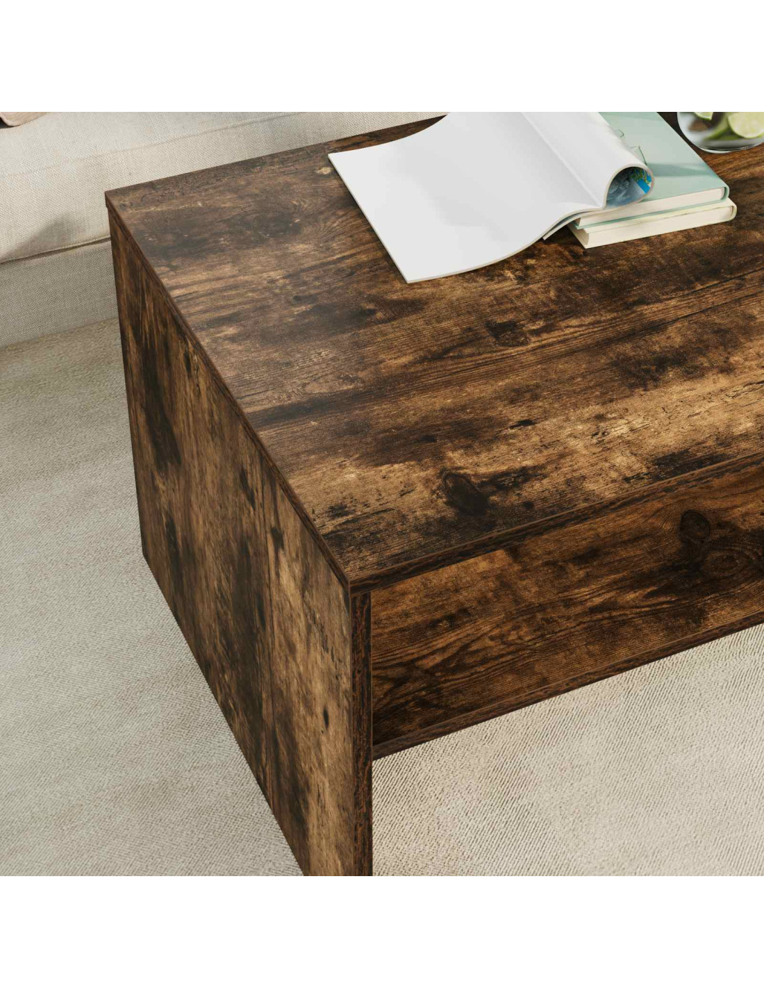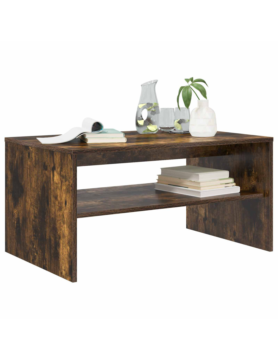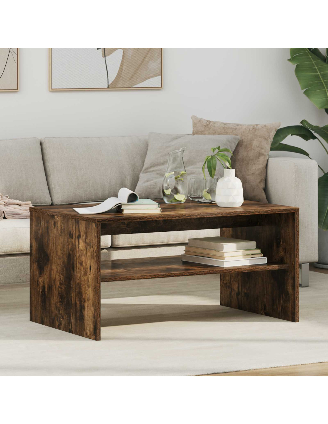 - Ripiani pratici Il tavolino ha ripiani a pannello che incrementano la funzionalità e forniscono soluzioni per riporre le cose. Questi ripiani, realizzati in legno ingegnerizzato dello stesso tipo, offrono un’armonia di materiali e aspetto, permettendo di organizzare libri, riviste e altri oggetti facilmente.