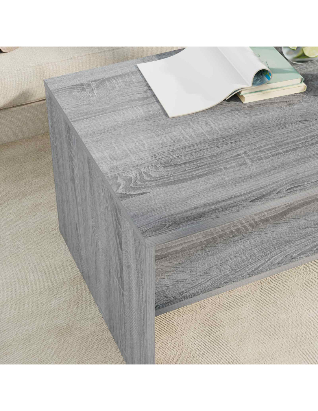 - Ripiani pratici Il tavolino ha ripiani a pannello che incrementano la funzionalità e forniscono soluzioni per riporre le cose. Questi ripiani, realizzati in legno ingegnerizzato dello stesso tipo, offrono un’armonia di materiali e aspetto, permettendo di organizzare libri, riviste e altri oggetti facilmente.