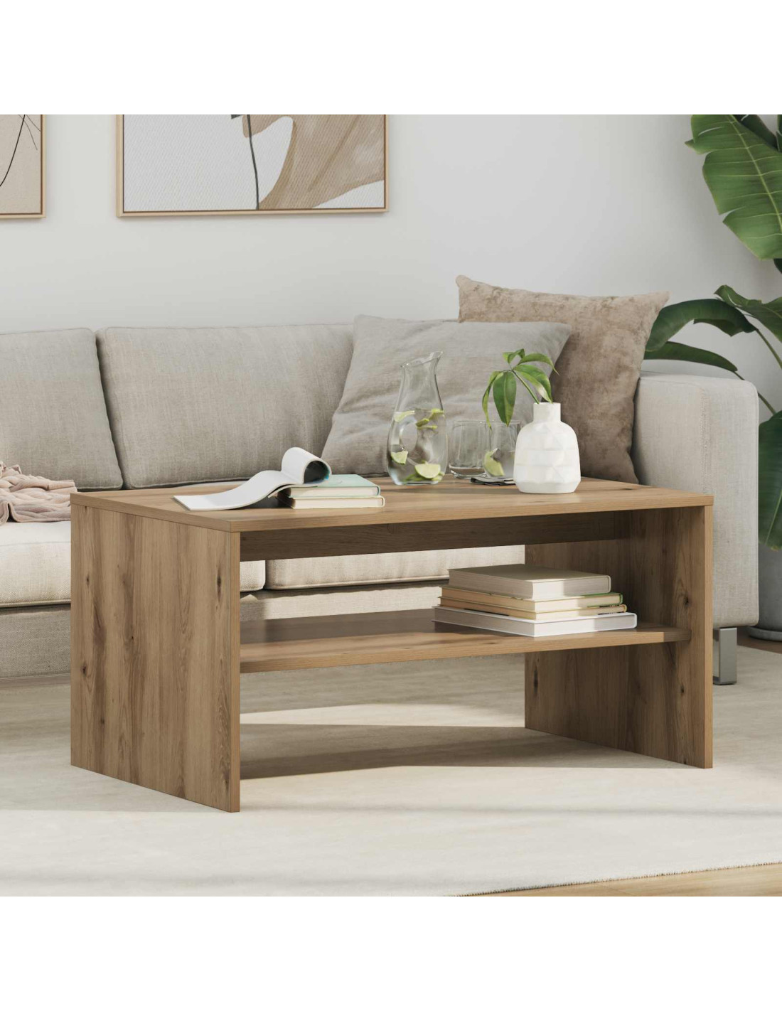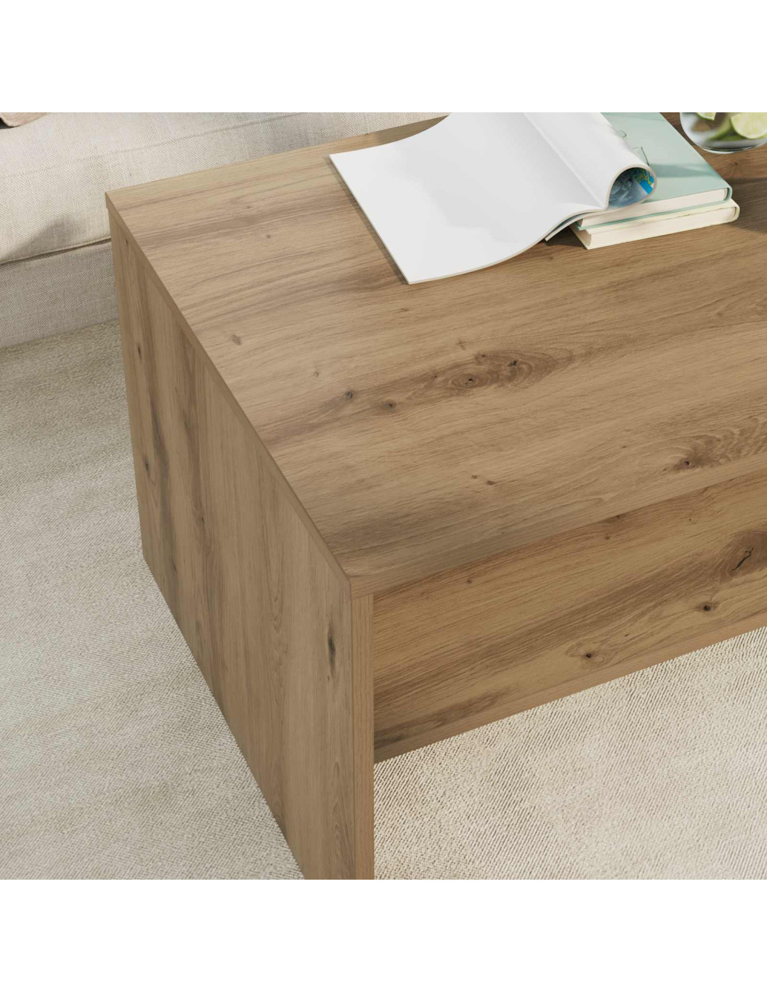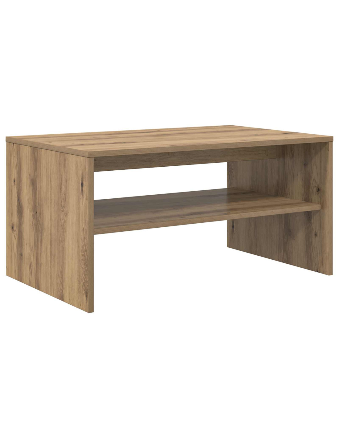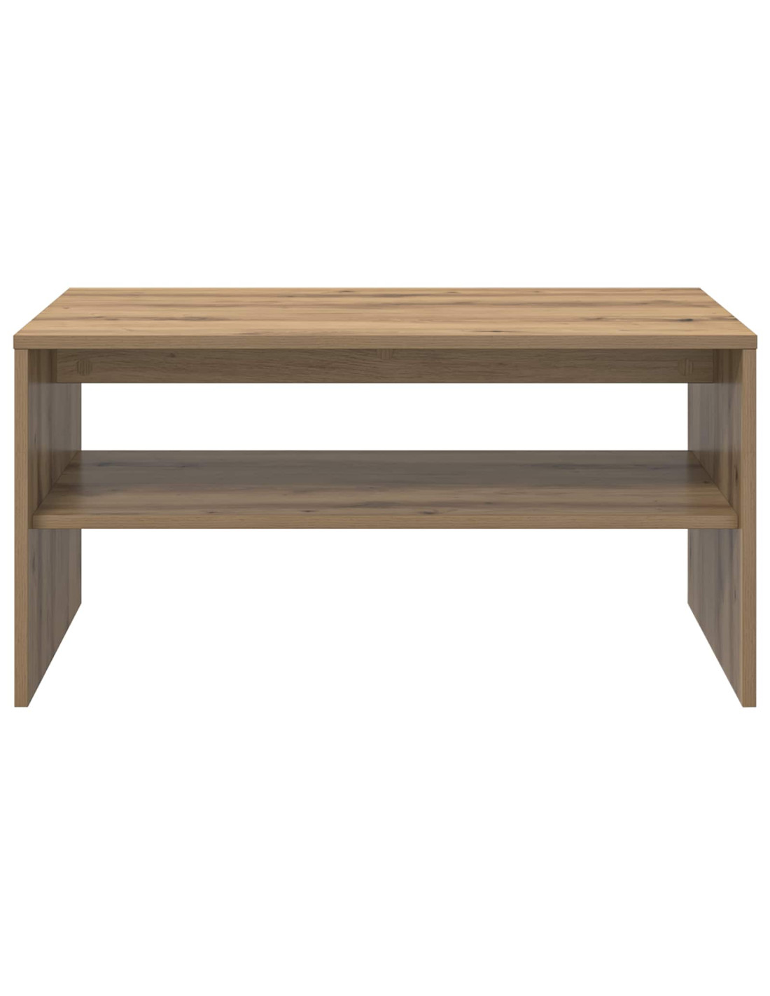 - Ripiani pratici Il tavolino ha ripiani a pannello che incrementano la funzionalità e forniscono soluzioni per riporre le cose. Questi ripiani, realizzati in legno ingegnerizzato dello stesso tipo, offrono un’armonia di materiali e aspetto, permettendo di organizzare libri, riviste e altri oggetti facilmente.