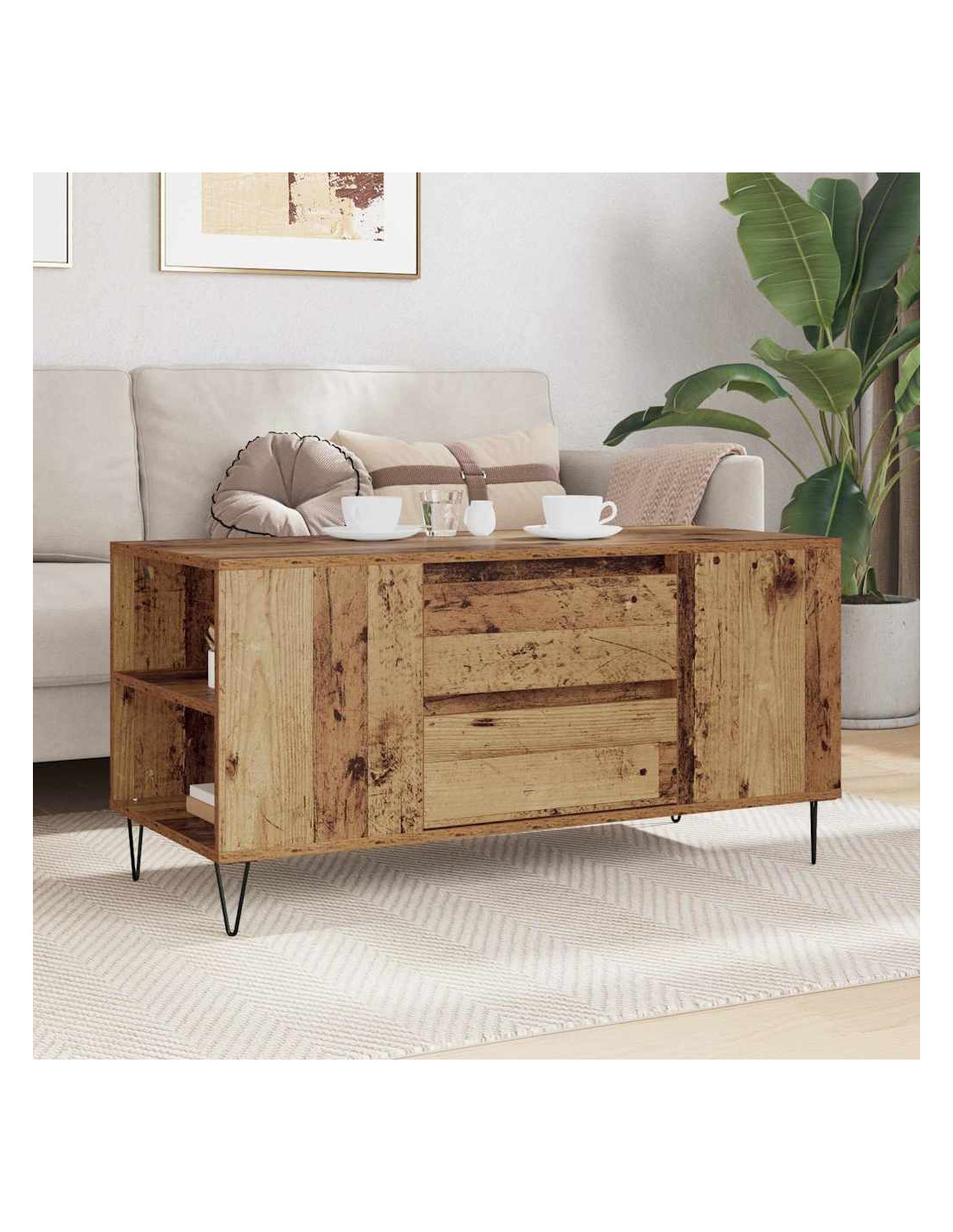 Questo tavolino da caffè moderno è il centro funzionale di ogni soggiorno. Il suo design elegante, con linee pulite e poche decorazioni, lo rende versatile per vari stili d'interno. Con dimensioni di 102 x 44.5 x 50 cm, offre una superficie ampia per oggetti decorativi e per appoggiare bevande o riviste. È progettato solo per uso interno, combinando semplicità e praticità in un elemento fondamentale per la casa.