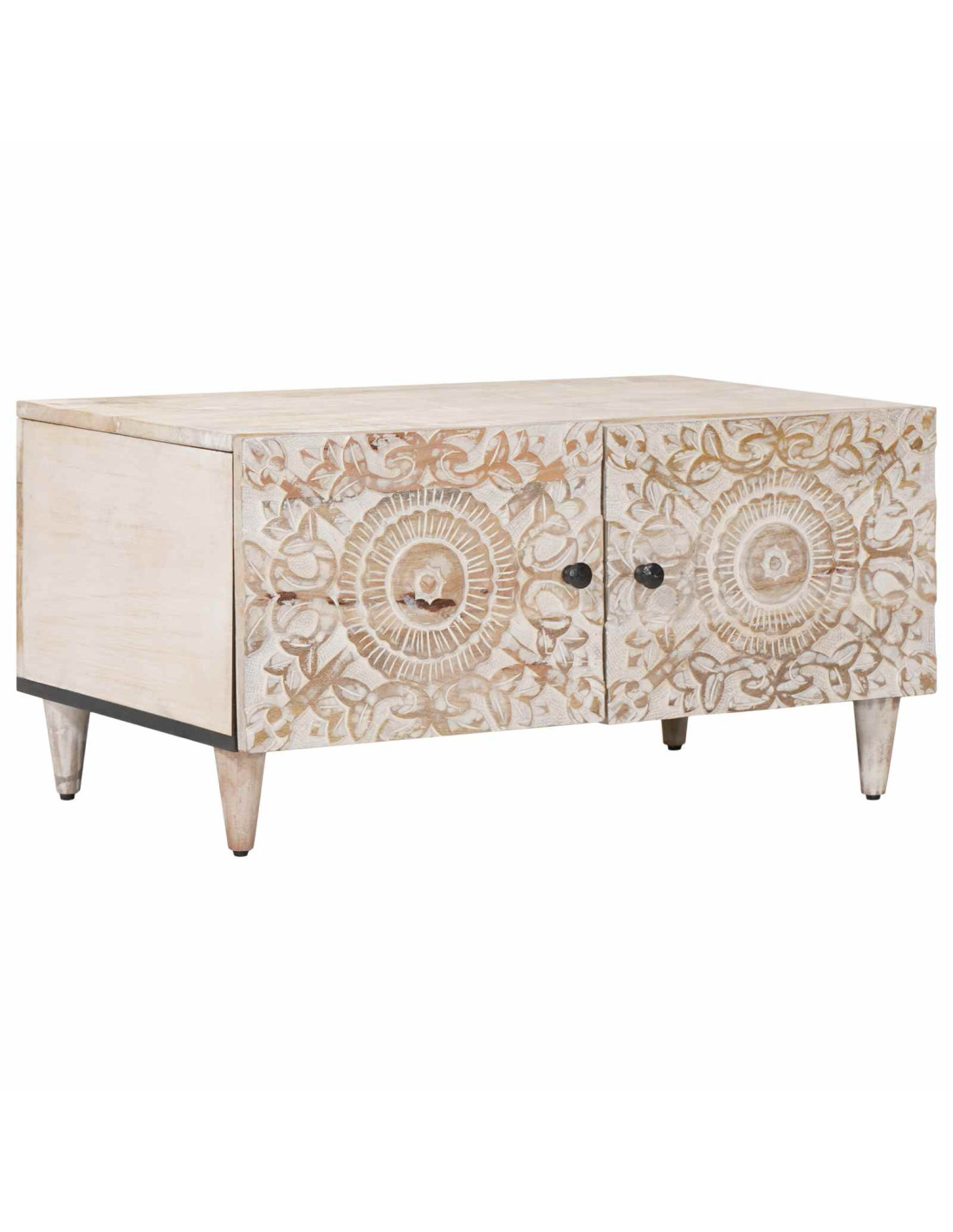 - Materiali: Questo tavolino è fatto interamente in legno massello di mango, mostrando la bella venatura e la resistenza del materiale. Il legno di mango è noto per la sua solidità, dunque il tavolo resiste all'uso quotidiano. Ogni pezzo è unico, mettendo in risalto il tuo buon gusto nel décor domestico.