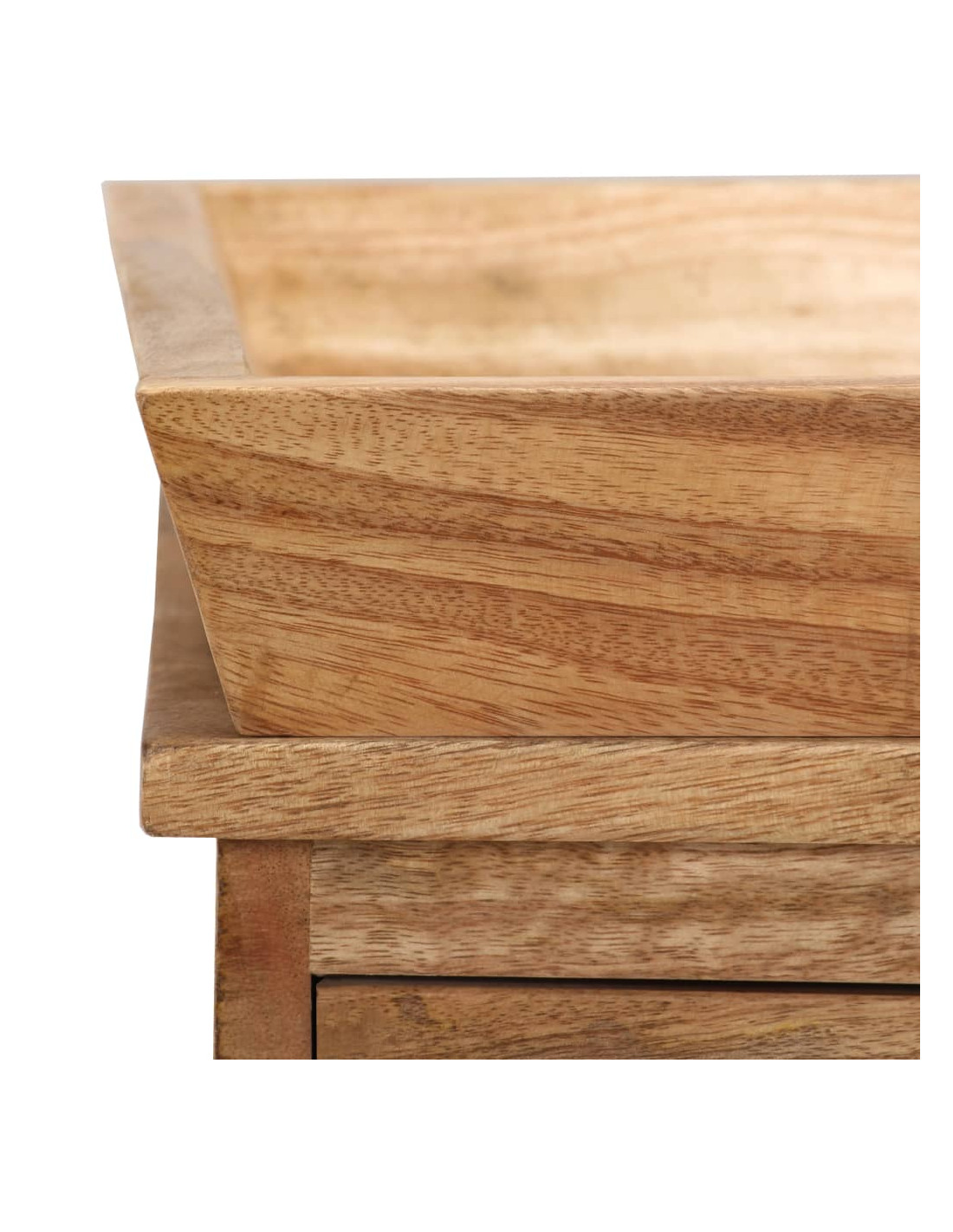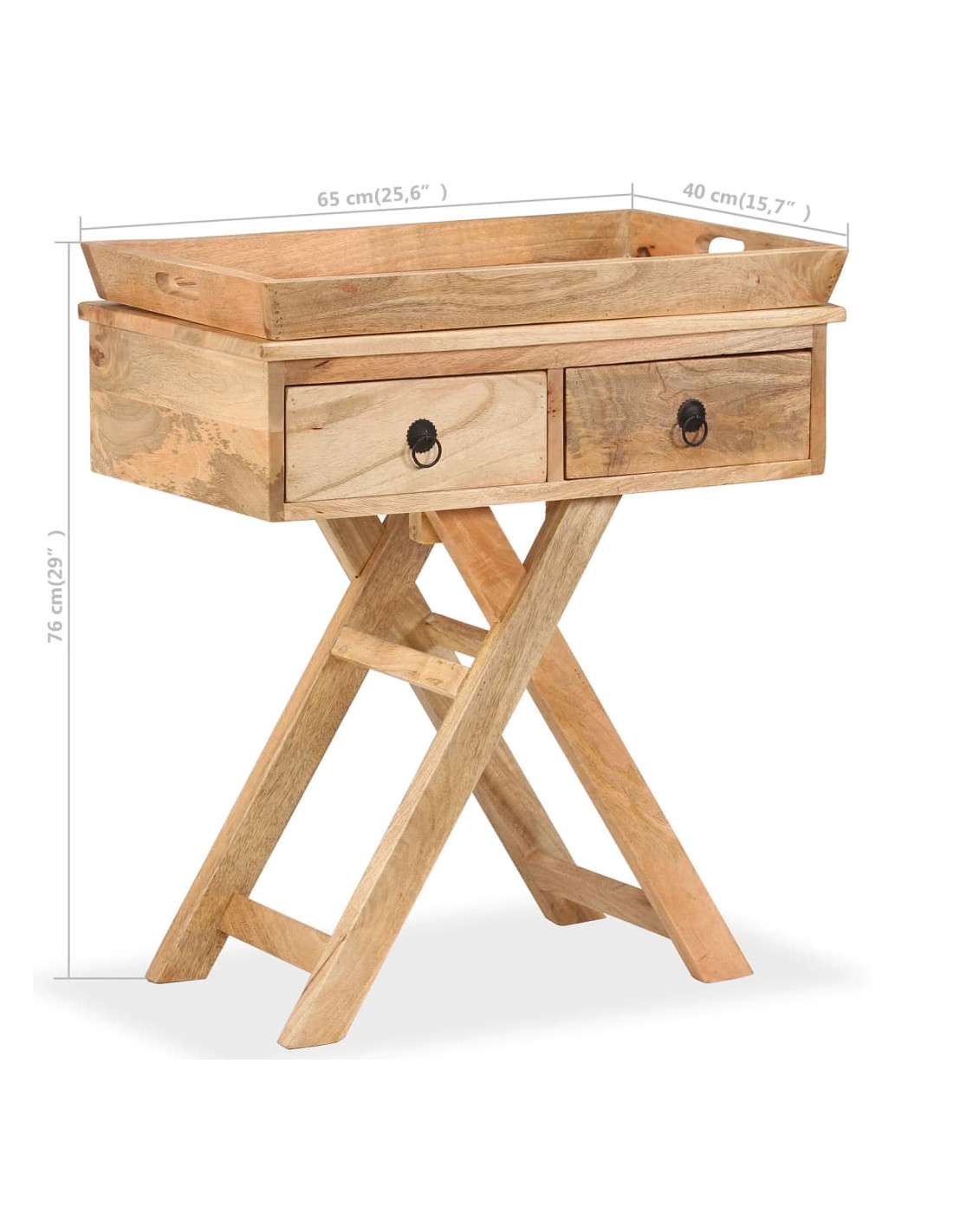 Il tavolino è realizzato a mano in legno di mango, solido, stabile, durevole e bello, e la lavorazione artigianale si aggiunge al suo spettacolare stile retrò. Ogni fase del processo viene effettuata con la massima cura, che si tratti di levigatura, lucidatura, pittura o laccatura. La lavorazione artigianale e le belle venature del legno rendono ogni mobile unico e leggermente diverso dagli altri. Il piano del tavolo funge anche da grande vassoio da portata che può essere facilmente rimosso per un uso separato quando necessario, e dispone di ampio spazio per bevande o oggetti decorativi come cestini di frutta o vasi. Progettato con due cassetti, il tavolino mantiene i vostri piccoli oggetti ordinatamente organizzati e a portata di mano. Le gambe a forma di X ne aumentano la robustezza e lo straordinario stile retrò. L'assemblaggio è semplice.