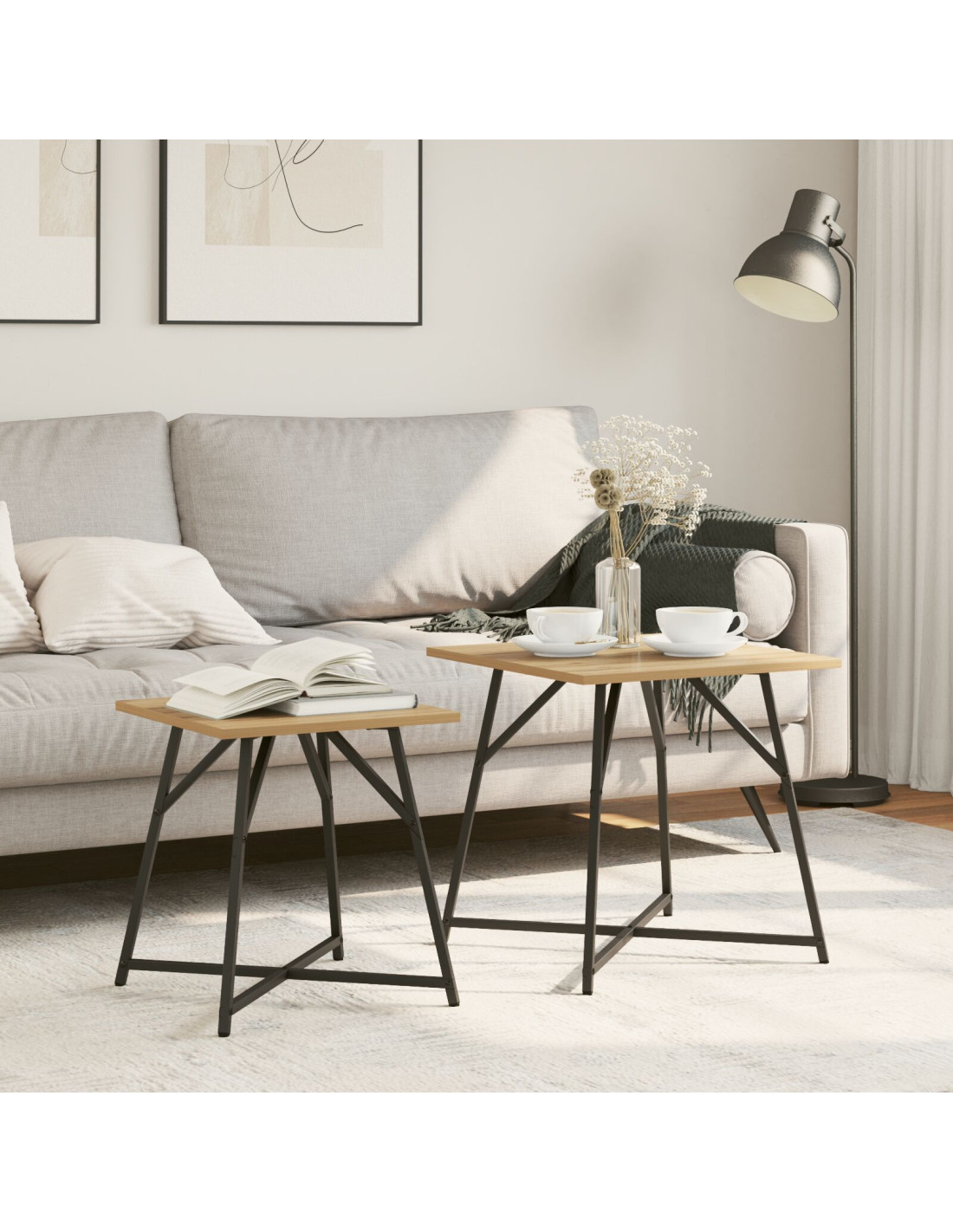 - Componenti Inclusi: Il set include due tavolini, ciascuno con dimensioni diverse: 50x50x50 cm e 40x40x45 cm. Progettati con precisione, sono adatti per contenere lampade o per fungere da superfici pratiche per drink e libri. Ogni tavolo è ben strutturato con telai in metallo dal design elegante.