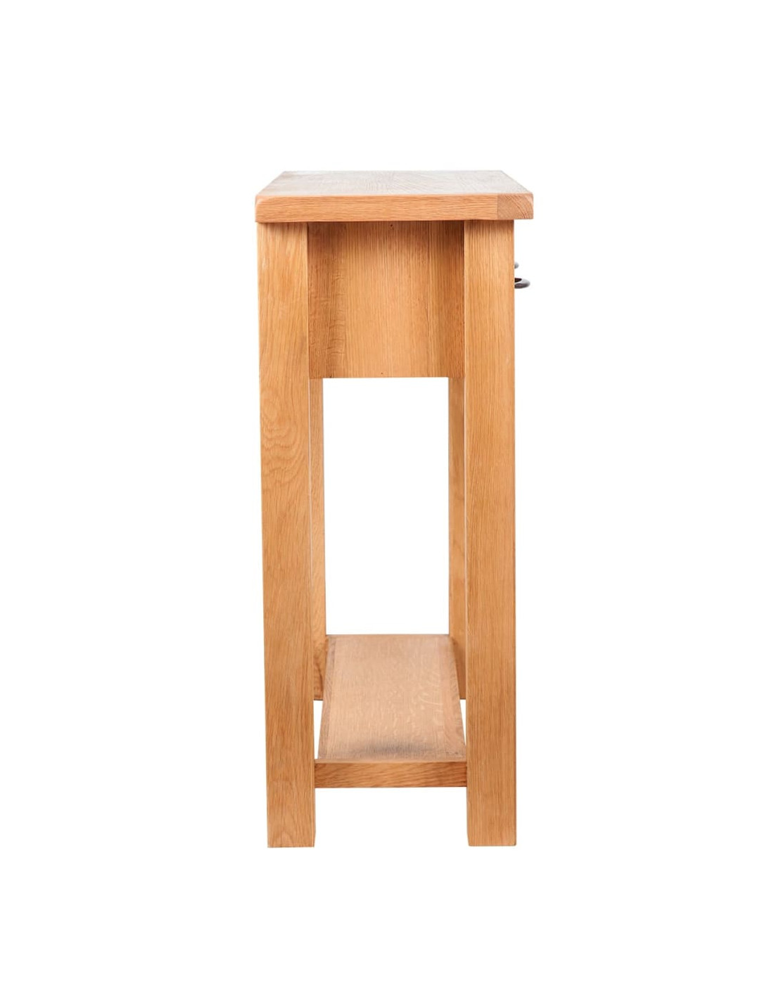 Il tavolo è intelligentemente realizzato in robusta quercia massiccia e altamente funzionale. Grazie al suo design compatto, la nostra consolle occupa pochissimo spazio e si inserisce in aree più piccole. Due cassetti ti offrono spazio aggiuntivo per i tuoi soprammobili, cosmetici ed altri piccoli oggetti.