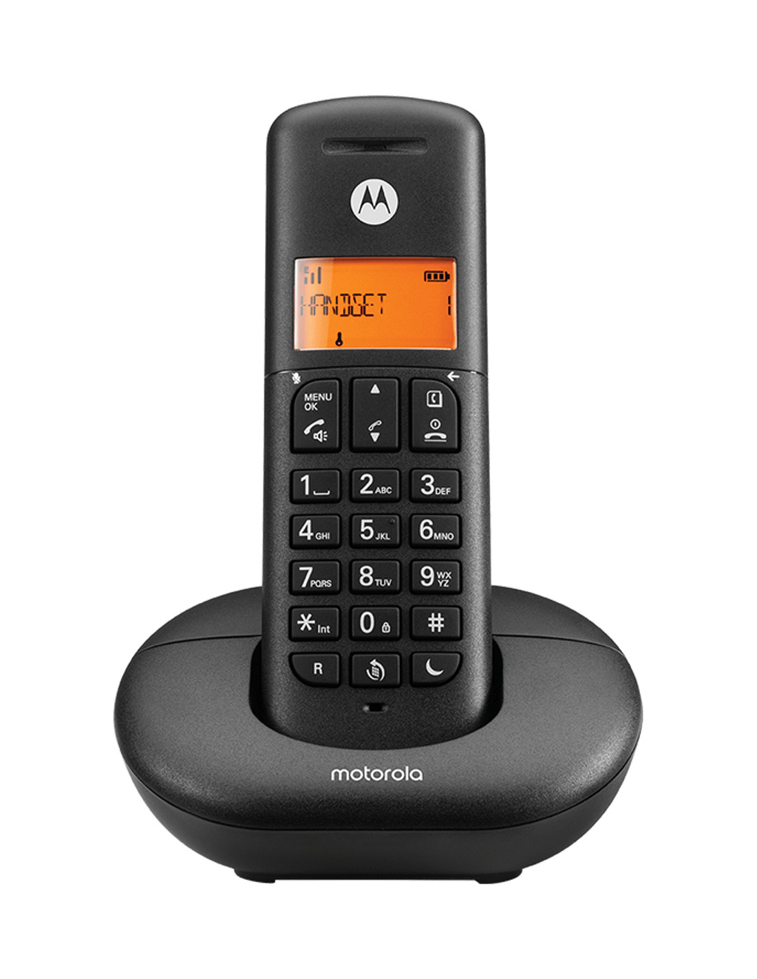 Motorola E201. Tipo: Telefono DECT, Tipo di apparecchio: Cornetta wireless. Telefono con vivavoce, Capacità rubrica: 50 voci. Identificatore di chiamata. Colore del prodotto: Nero. Numero di cornette incluse: 1