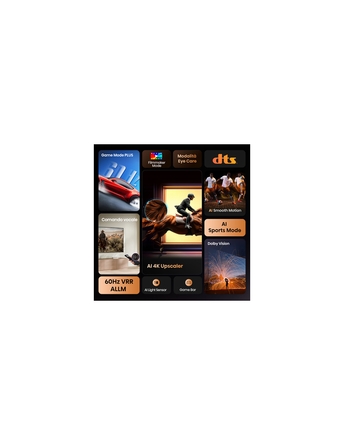 Sperimenta immagini fluide e realistiche con funzionalità avanzate come MEMC (Motion Estimation, Motion Compensation) e 3D Noise Reduction, integrate in un pannello altamente reattivo. Con la tecnologia AI Smooth Motion, il fastidioso motion blur appartiene al passato. Che si tratti di sport frenetici o di giochi ricchi di azione, ogni movimento e svolta improvvisa viene reso con nitidezza, assicurando che le scene dinamiche appaiano fluide e realistiche.