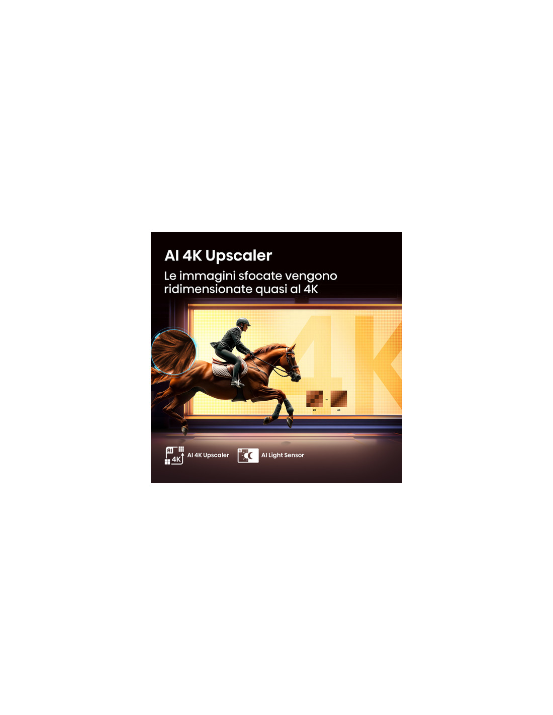 L'Upscaler Al 4K di Hisense sblocca una chiarezza superiore per tutti i tuoi contenuti preferiti. Questa funzione intelligente rimodella non solo i tuoi amati classici e filmati, ma anche le moderne trasmissioni TV, i film e persino i contenuti in streaming in una straordinaria qualità 4K. Ogni pixel viene elevato alla potenza del tuo televisore.