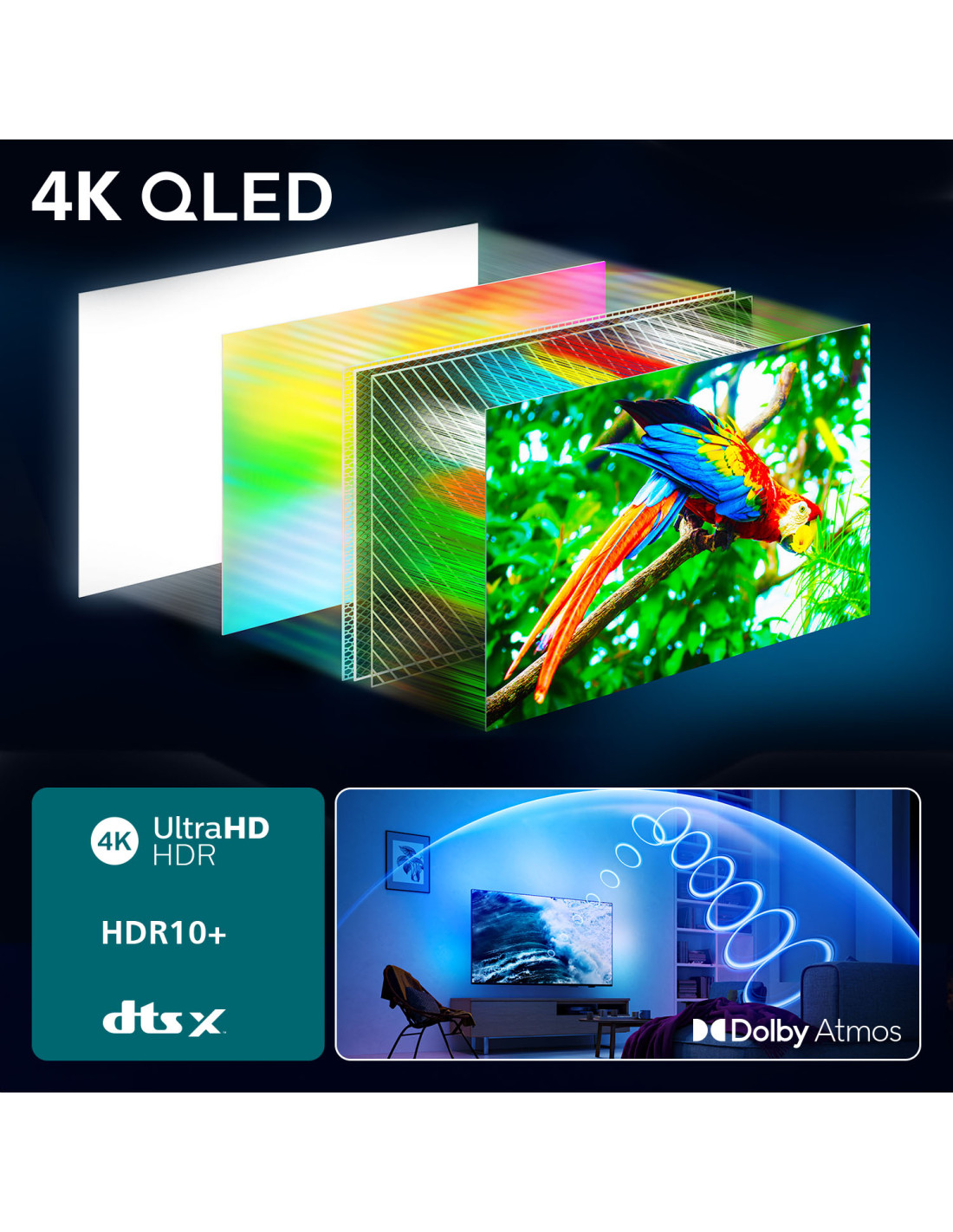 Preparati alla brillantezza dei colori in QLED 4K. Tutta la magia di Ambilight. Dolby Atmos con un audio 3D simile a quello del cinema. E grazie a Titan OS, che ti consente di guardare tutto ciò che ami, questo TV non solo arricchisce i tuoi momenti speciali, ma offre anche una migliore esperienza visiva.