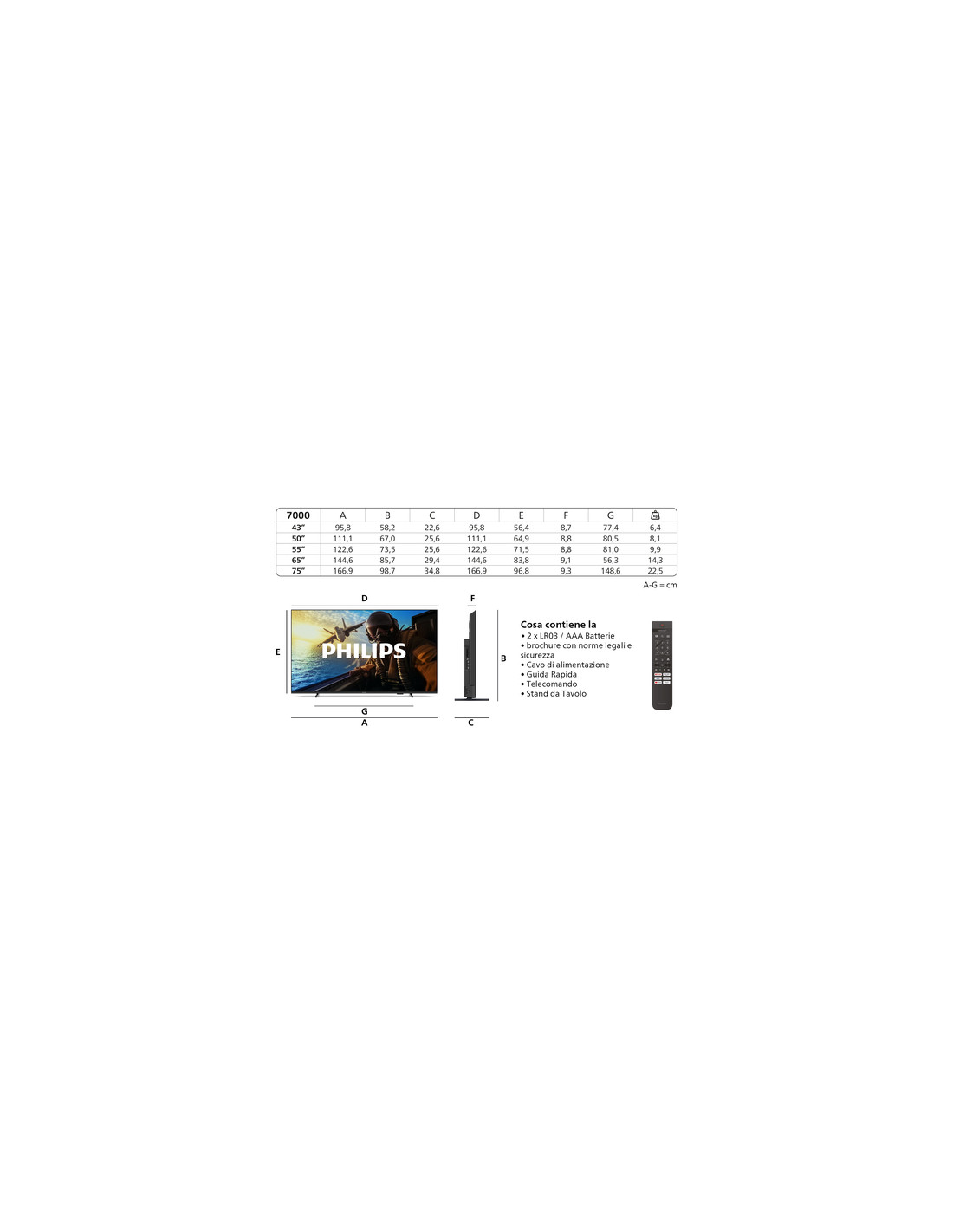 Philips Serie 7000 55PUS7000 4K UHD LED 139cm 55" Smart TV Dolby Atmos Titan OS. Dimensioni diagonale schermo: 139,7 cm (55"), Risoluzione del display: 3840 x 2160 Pixel, Tipologia HD: 4K Ultra HD, Tecnologia display: LED, Forma dello schermo: Piatto. Smart TV. Rapporto d'aspetto nativo: 16:9. Formato del segnale digitale: DVB-C, DVB-S, DVB-S2, DVB-T, DVB-T2, DVB-T2 HD. Wi-Fi, Collegamento ethernet LAN. Colore del prodotto: Nero