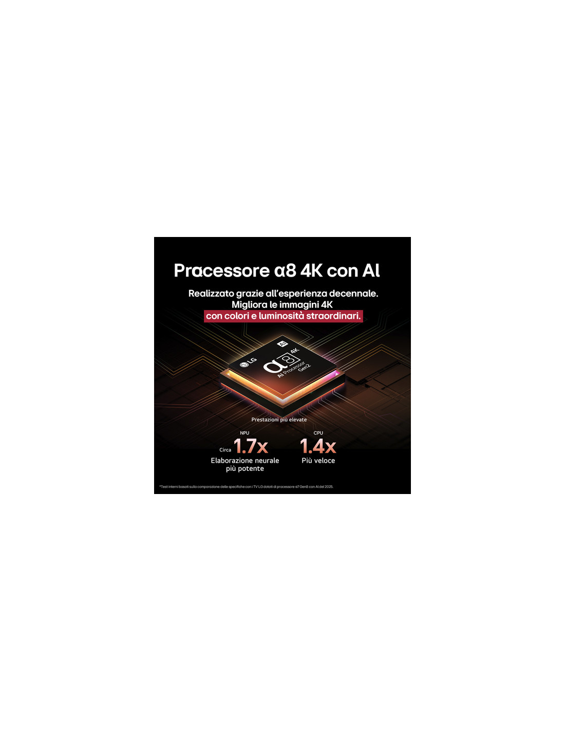 Il processore α8 Gen2 sviluppato da LG è progettato per sfruttare il deep-learning dell'Intelligenza Artificiale per riconoscere ciò che stai guardando e migliorare automaticamente il suono e le immagini fotogramma per fotogramma. Ad esempio, analizza ogni fotogramma per migliorare la risoluzione, ridurre il rumore e, sul fronte audio, offrirti un suono surround virtuale fino a 9.1.2 canali.