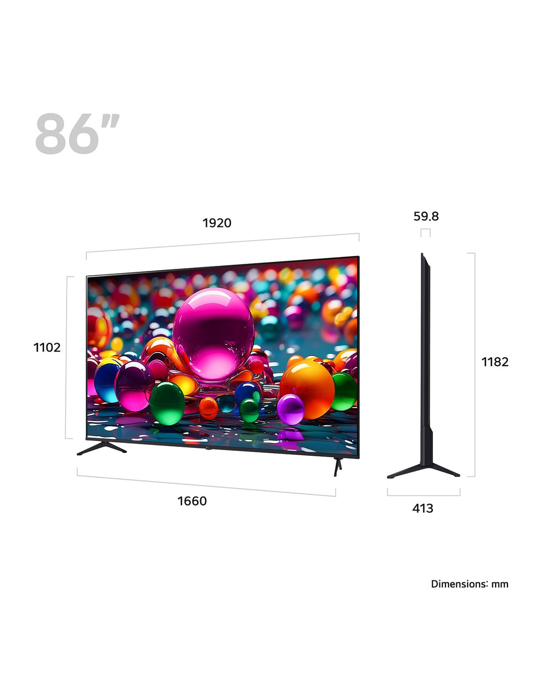 LG 86UA75006LA. Dimensioni diagonale schermo: 2,18 m (86"), Risoluzione del display: 3840 x 2160 Pixel, Tipologia HD: 4K Ultra HD, Tecnologia display: LCD, Forma dello schermo: Piatto, Tipo di retroilluminazione LED: Direct-LED. Smart TV. Formato del segnale digitale: DVB-C, DVB-S, DVB-S2, DVB-T, DVB-T2. Wi-Fi, Collegamento ethernet LAN. Colore del prodotto: Nero