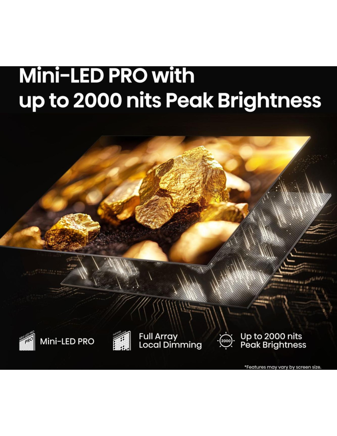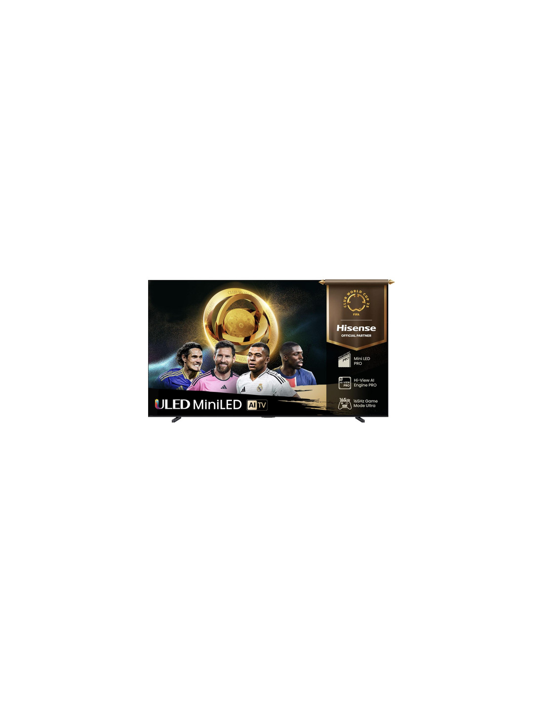 Hisense 100U7Q PRO. Dimensioni diagonale schermo: 2,54 m (100"), Risoluzione del display: 3840 x 2160 Pixel, Tipologia HD: 4K Ultra HD, Tecnologia display: ULED, Forma dello schermo: Piatto, Tipo di retroilluminazione LED: Mini LED PRO. Smart TV. Tempo di risposta: 6 ms, Rapporto di contrasto: 5000:1, Rapporto d'aspetto nativo: 16:9. Formato del segnale digitale: DVB-C, DVB-S, DVB-S2, DVB-T, DVB-T2. Wi-Fi, Collegamento ethernet LAN. Colore del prodotto: Nero