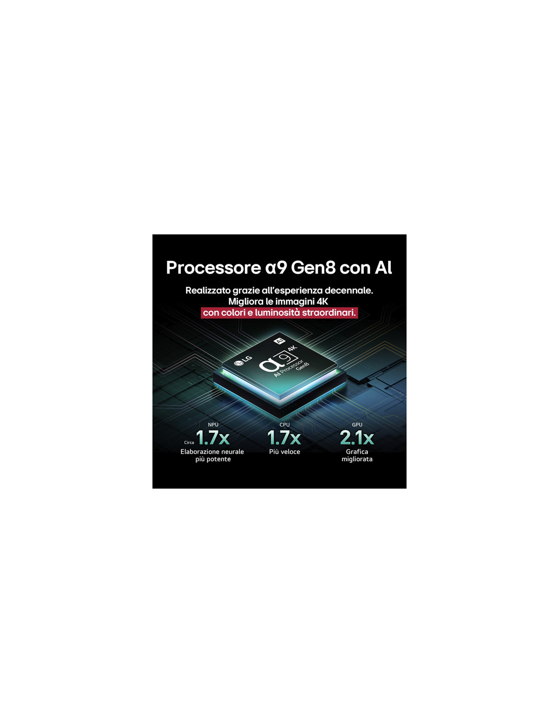 Il processore α9 sviluppato da LG è progettato per sfruttare al meglio la tecnologia OLED e darti un realismo incredibile. Giunto all'ottava generazione, questo processore conosce a fondo le caratteristiche del pannello e sfrutta gli algoritmi di deep-learning dell'Intelligenza Artificiale progressiva per riconoscere le scene di ciò che stai guardando e ottimizzare di conseguenza i contenuti, esaltando ciascun soggetto sulla scena.