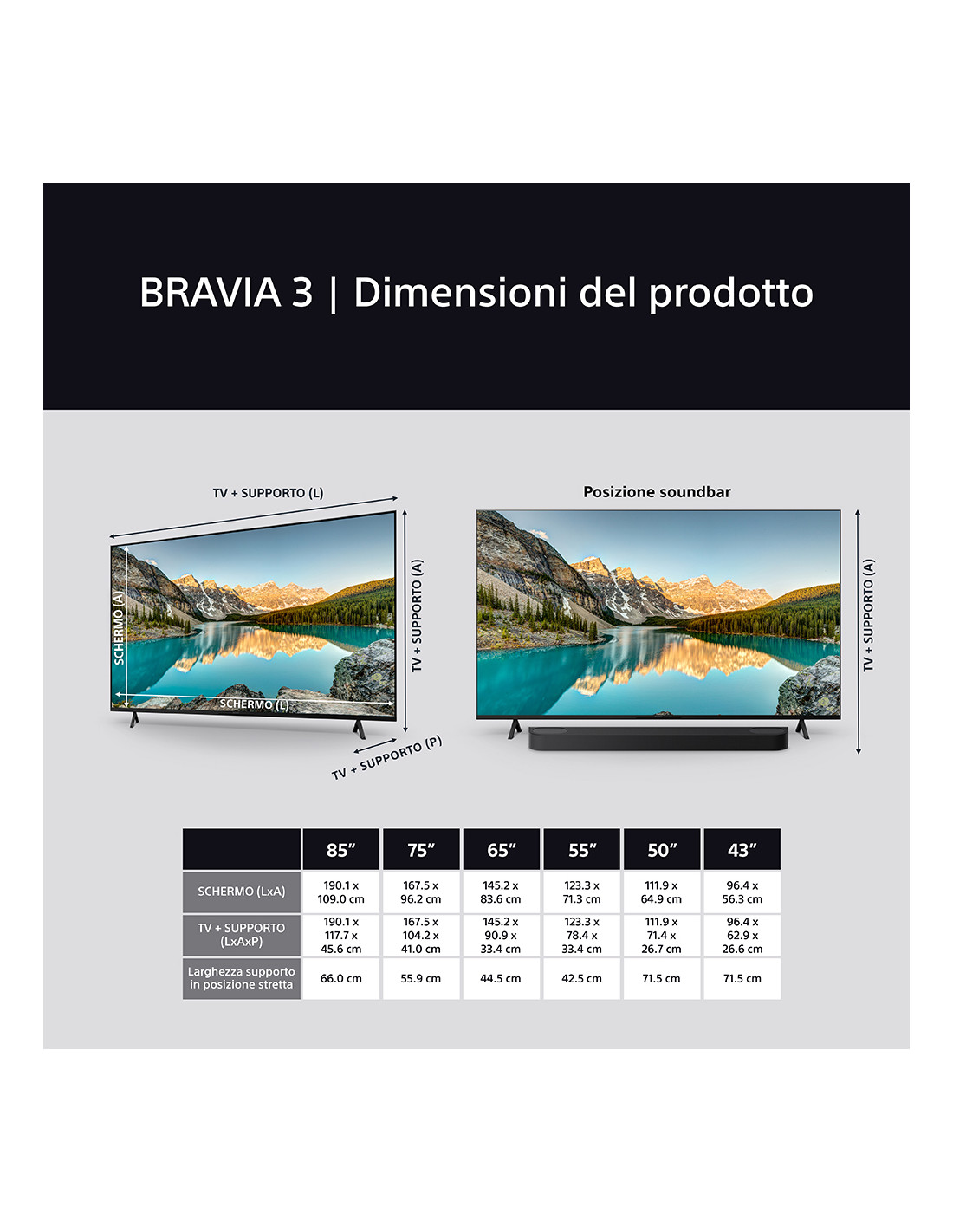 Sony K-85S3. Dimensioni diagonale schermo: 2,15 m (84.6"), Risoluzione del display: 3840 x 2160 Pixel, Tipologia HD: 4K Ultra HD, Tecnologia display: LED, Forma dello schermo: Piatto, Tipo di retroilluminazione LED: Direct-lit LED. Smart TV. Tecnologia di interpolazione del movimento: Motionflow XR 240 Hz, Rapporto d'aspetto nativo: 16:9. Formato del segnale digitale: DVB-C, DVB-S, DVB-S2, DVB-T, DVB-T2. Wi-Fi, Collegamento ethernet LAN. Colore del prodotto: Nero