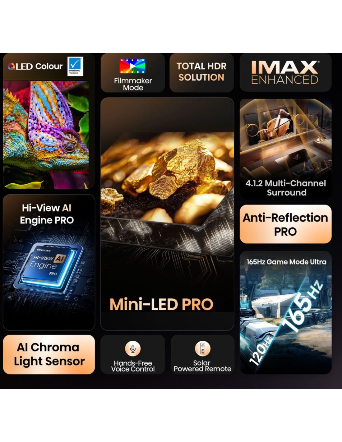 Che si tratti di una stanza illuminata dal sole o di una lampada da notte, i riflessi non interferiscono più con la vista. L'Anti-Reflection PRO di Hisense contrasta i riflessi indesiderati e garantisce che il tuo schermo venga visualizzato esattamente come dovrebbe: pura brillantezza cinematografica.