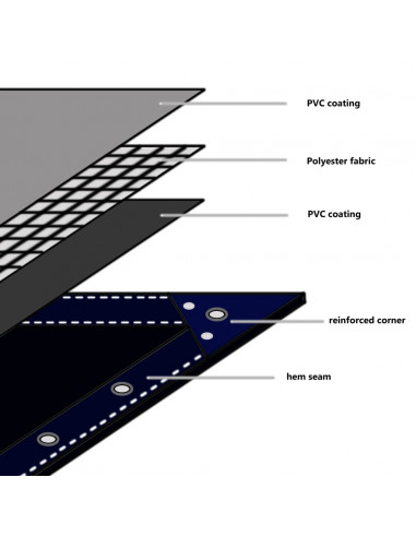 Il telone è realizzato in tela di alta qualità con un rivestimento in PVC che rende il prodotto resistente agli strappi, all'acqua, ai raggi UV e può essere utilizzato in un intervallo di temperatura compreso tra -30 °C e 70 °C. È dotato di occhielli su tutti gli angoli e lungo i bordi per un fissaggio semplice.