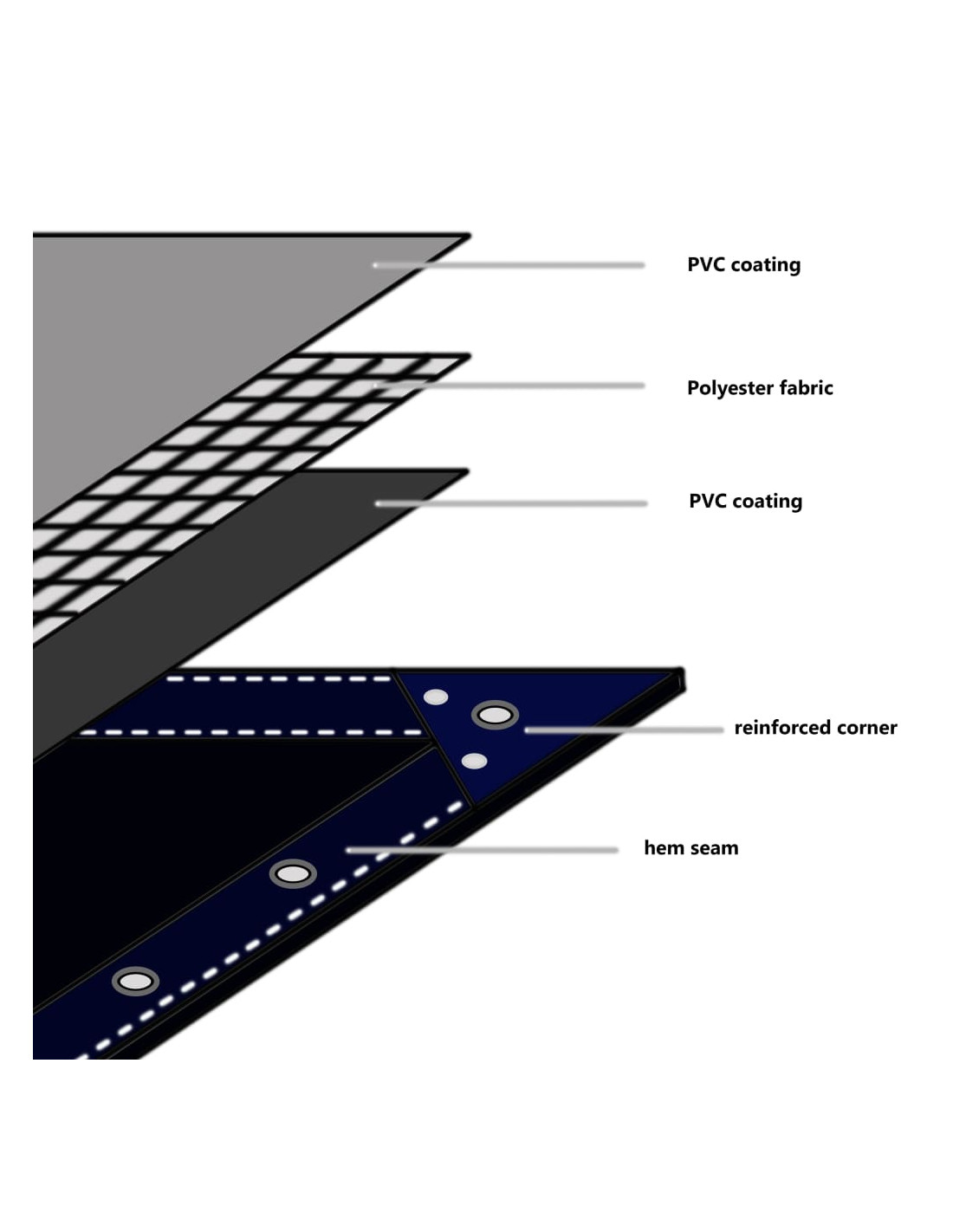 Il telone è realizzato in tela di alta qualità con un rivestimento in PVC che rende il prodotto resistente agli strappi, all'acqua, ai raggi UV e alle muffe. Può essere utilizzato in un intervallo di temperatura compreso tra -30 °C e 70 °C. È dotato di occhielli su tutti gli angoli e lungo i bordi per un fissaggio semplice.